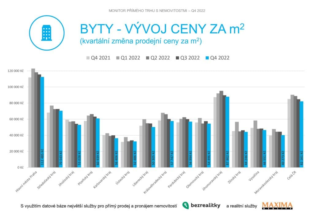 Ceny bytů mezikvartálně klesly po celé republice o jednotky procent. V Praze ztratil průměrný 65metrový byt v širším centru oproti loňskému jaru na hodnotě skoro 680 tisíc korun a v současnosti se prodává za stejnou cenu jako před 12 měsíci – tedy za zhruba 112,5 tisíce korun za metr čtvereční. Podobný vývoj cen zaznamenala i moravská metropole. Stejný byt v Brně oproti loňskému maximu ztratil na hodnotě 475 tisíc. A shodou okolností i zde se ceny přiblížily hodnotám z konce roku 2021. Průměrná cena metru čtverečního zde klesla na 87 902 Kč za metr čtvereční.