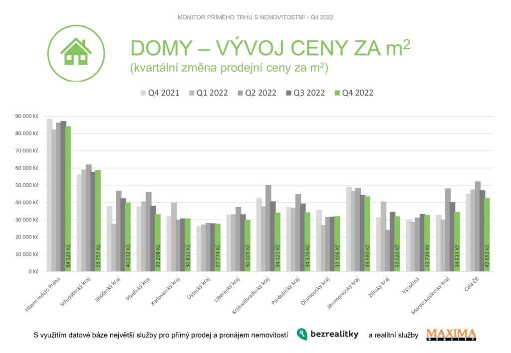 Naopak o 2 % na 58 757 Kč za metr čtvereční (druhá nejvyšší hodnota v republice) vzrostly průměrné ceny rodinných domů ve Středočeském kraji. Prodej je zde tak jako v minulých měsících totiž výrazně podpořen neutuchající pražskou poptávkou. Oproti tomu v Praze průměrná cena prodaného rodinného domu klesla o další 3 % na 84 229 Kč za metr čtvereční, v Jihomoravském kraji o 2 % na 43 580 Kč za metr čtvereční – opět především kvůli skutečnosti, že se nyní prodávají spíše méně kvalitní nemovitosti.