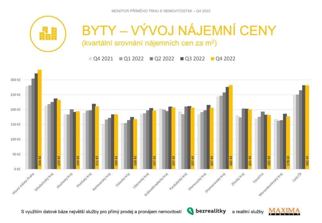 I díky tomu přestaly ceny nájemního bydlení růst tak rychlým tempem nebo přešly do stagnace. Jedinou výjimkou se stala Praha a Brno. V hlavním městě vzrostly nájmy oproti podzimu o 4 % na 334 Kč korun za metr – tedy zhruba 21,5 tisíce za průměrný 65metrový byt. V Brně pak vyrostly o 2 % na 282 korun za metr – tedy cca 18,5 tisíce za průměrný 65metrový byt. Na Ostravsku nájemní ceny bytů dokonce klesly, a to o pět procent na 178 korun za metr čtvereční. Průměrný 65metrový byt se zde pronajímá za 11,5 tisíce korun.
