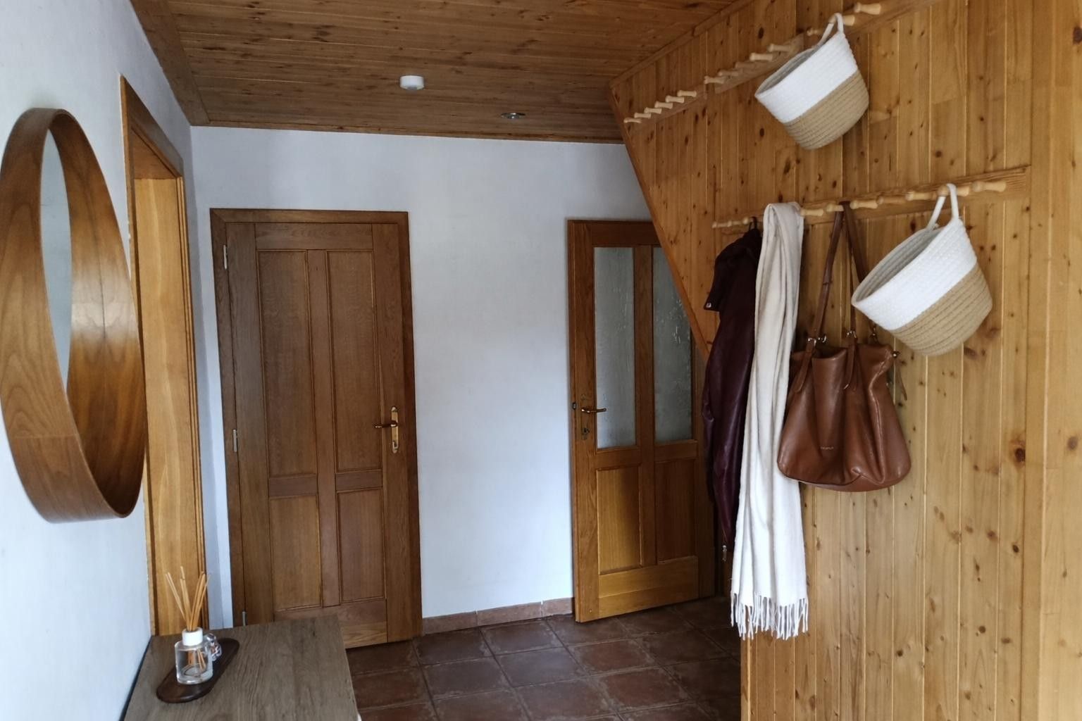 The ground floor comprises a bedroom with a separate walk in wardrobe, a living room with a functional fireplace, a kitchen with dining area, an additional room, a bathroom with toilet, bathtub and shower, and a separate utility room with an additional toilet. The attic floor offers three separate rooms with sloped ceilings and a bathroom with toilet and bathtub. The attic is currently not used for permanent living. Access is provided via a covered wooden staircase from the hallway. There is also a covered, unheated attic space of approximately 52 m² suitable for storage. The house is partially furnished and available immediately.