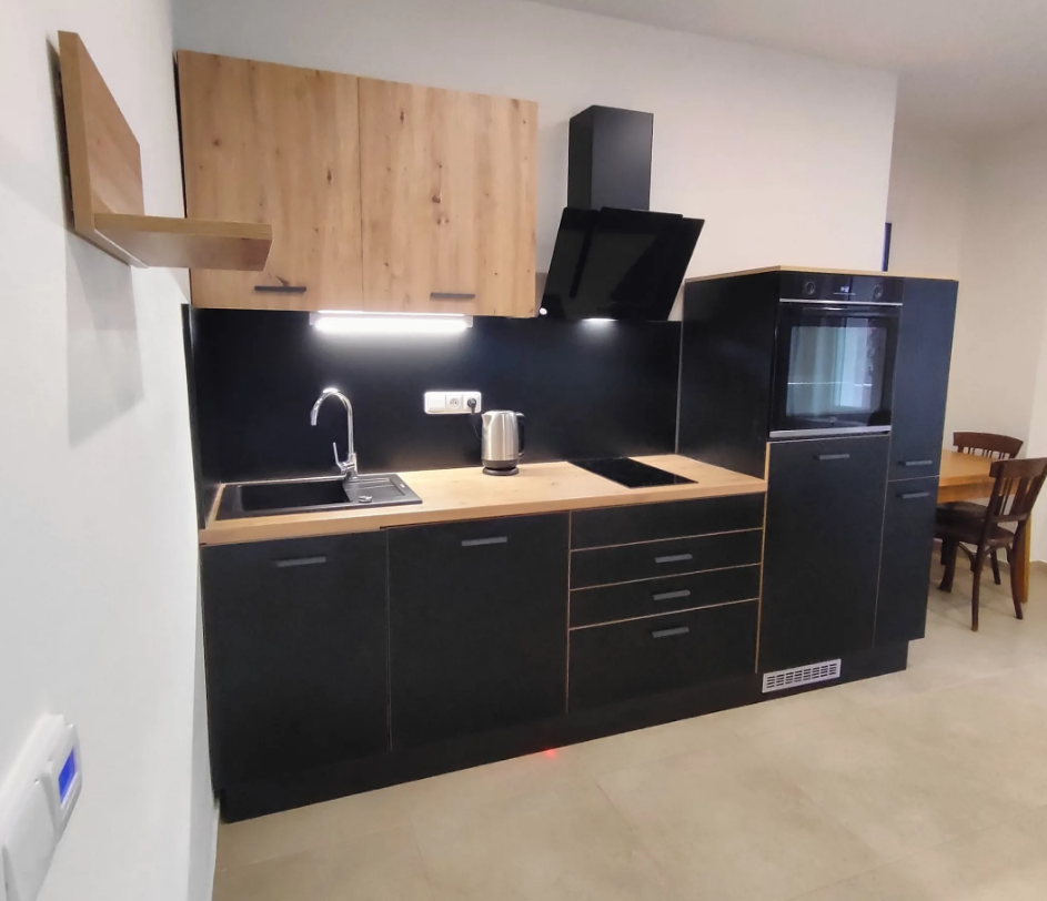 The living area features a kitchenette equipped with a dishwasher, built-in Teko refrigerator with freezer, Beko oven, and a MORA extractor hood with filter. Additionally, there is a two-burner stove. Everything is electric.