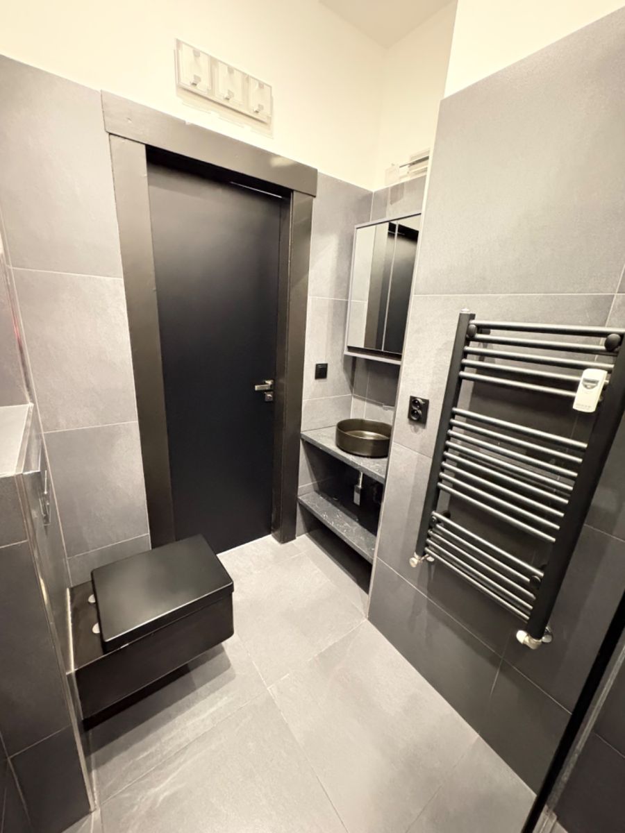 The designer bathroom in a black-and-grey color scheme features a modern walk-in shower, a countertop washbasin with a mirror cabinet, and new shower fixtures. An Indesit washing machine is also available.
