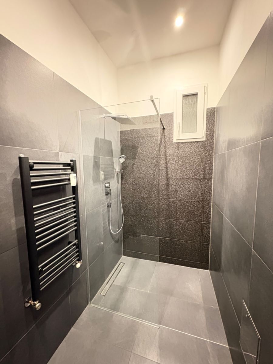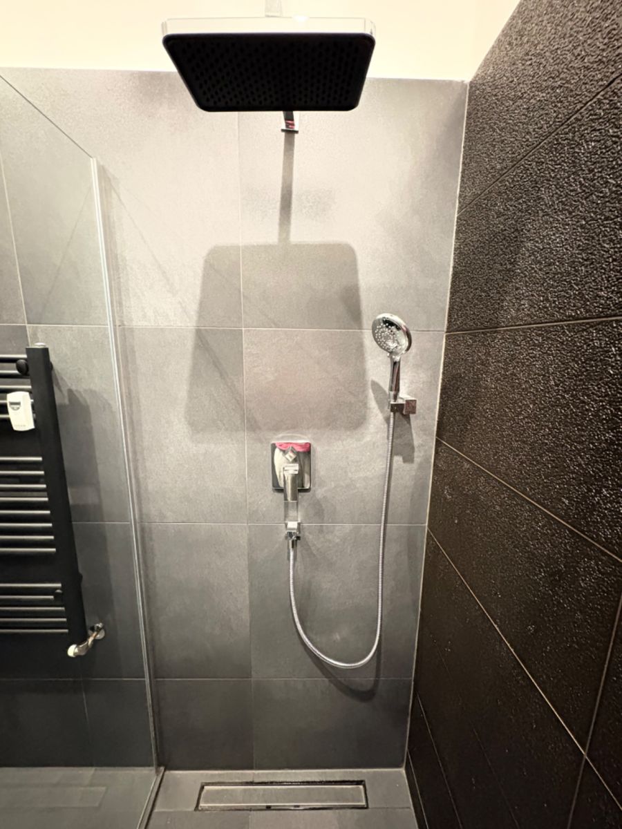 Designová koupelna v černo-šedé kombinaci nabízí moderní walk-in sprchový kout, umyvadlo na desce se zrcadlovou skříňkou a nové sprchové prvky. K dispozici je také pračka Indesit.