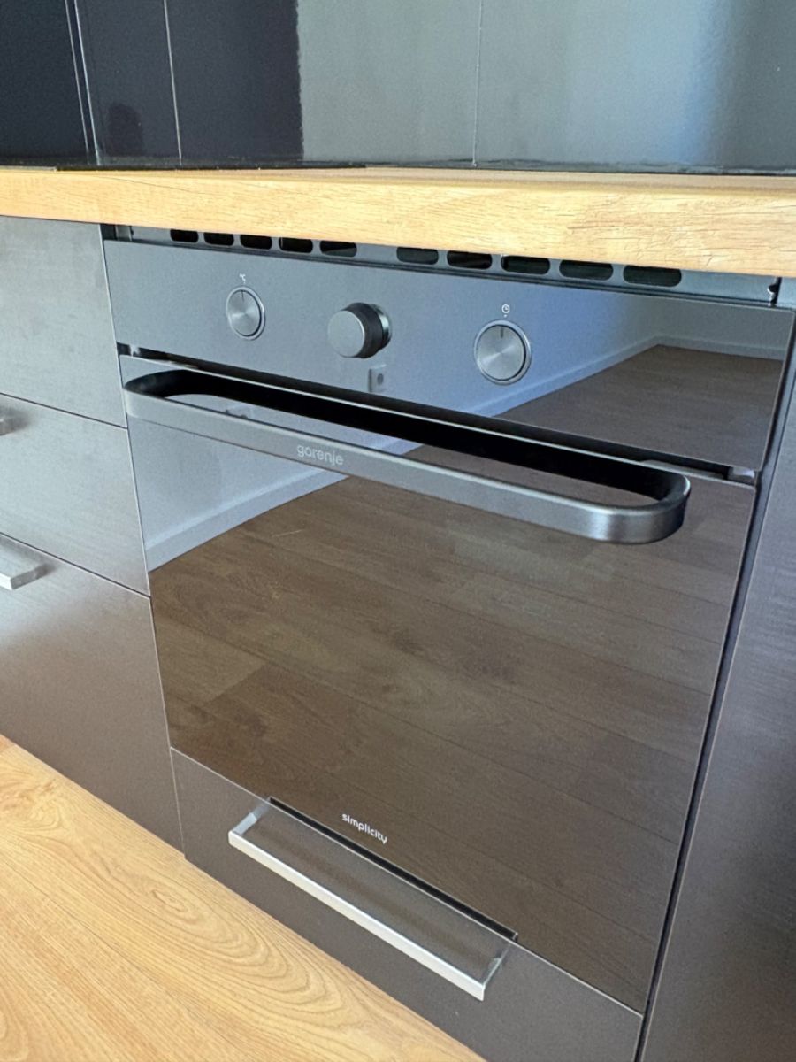 The kitchen unit is equipped with integrated appliances – an Indesit dishwasher, a brand-new Gorenje induction hob, and a brand-new Gorenje multifunctional convection oven, complemented by an extractor hood.
