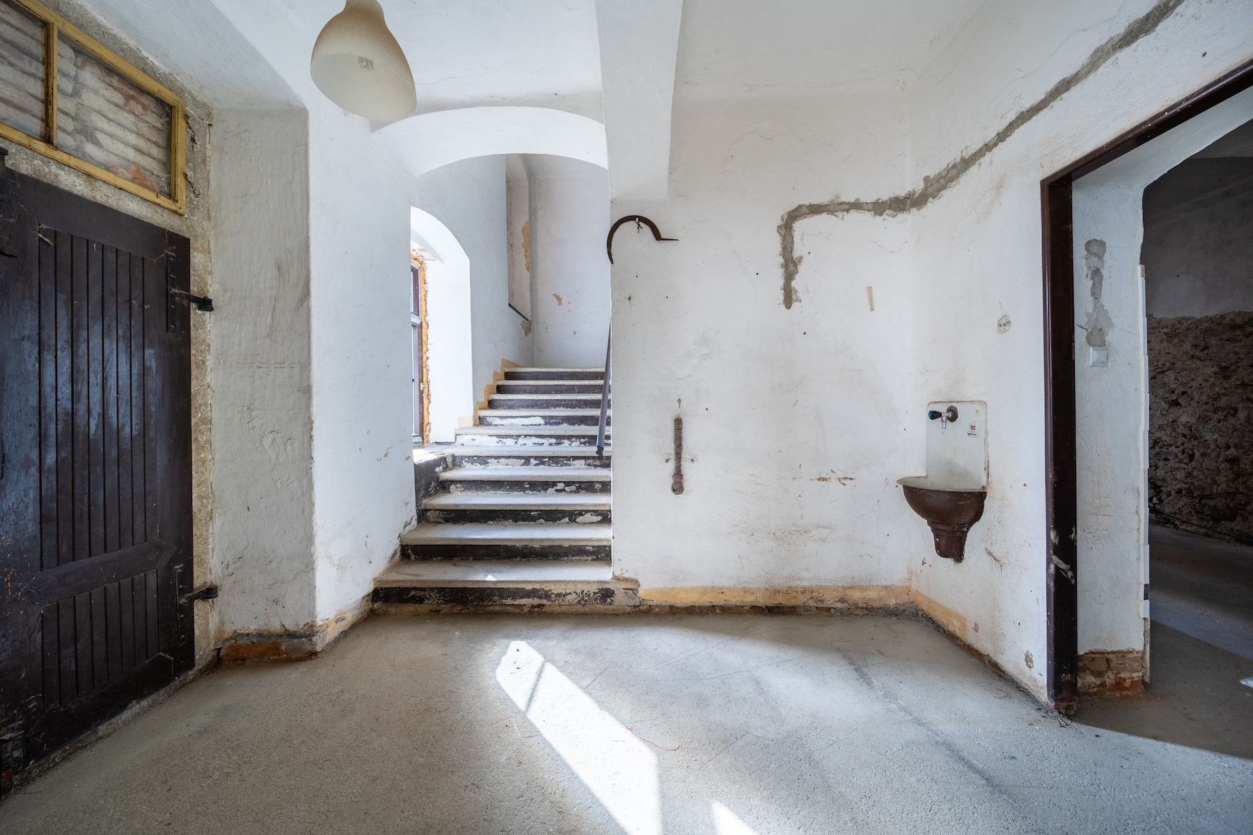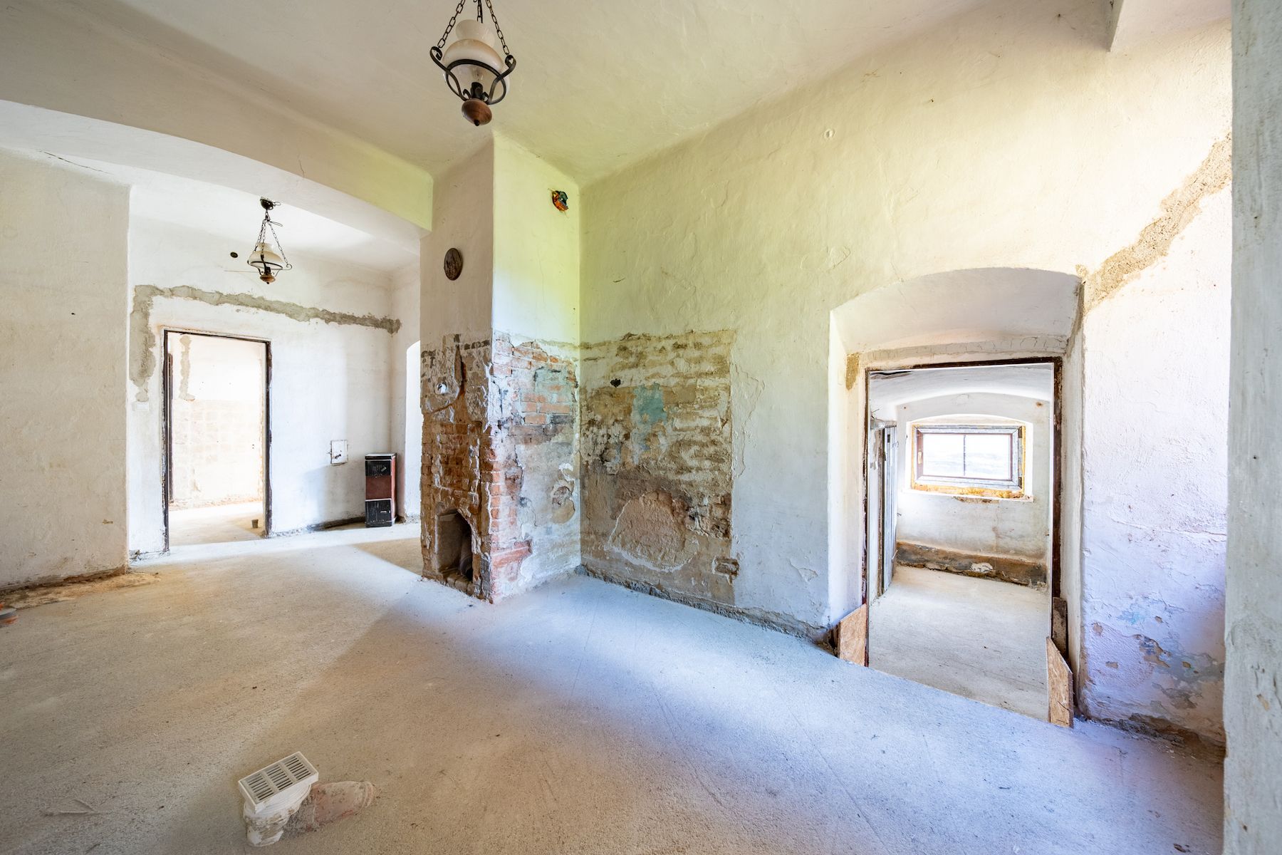 Původní dispozice zahrnuje 2 prostorné bývalé třídy v přízemí a prvním patře a samostatný pokoj, který sloužil jako byt pro učitele, nyní může být skvělým zázemím pro majitele nebo správce objektu. Nové elektrické rozvody již počítají se samostatnými okruhy a potenciálem pro vybudování samostatných apartmánů.