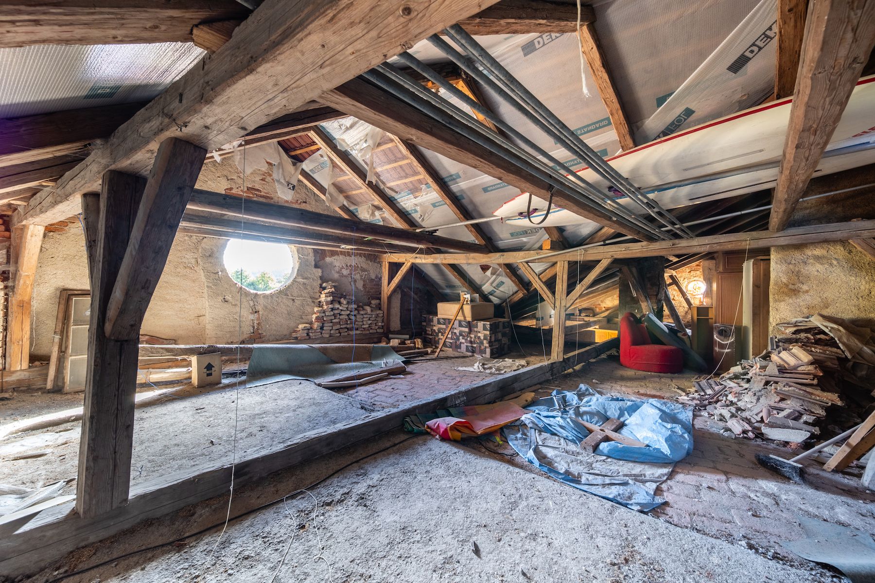 Velkorysý půdní prostor s rozetovým oknem je ideální pro vestavbu a vybudování útulného podkrovního bydlení. Započatá rekonstrukce zahrnuje novou betonovou podlahu v přízemí s drenážním systémem, nová plastová okna a kompletní elektroinstalaci v mědi.