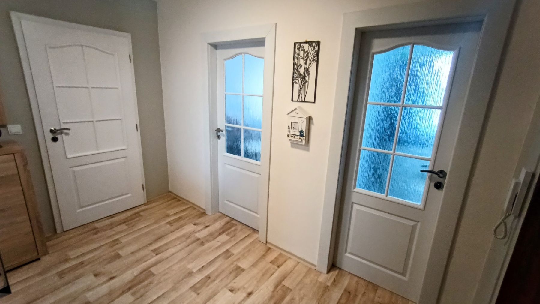 2015 – nové sádrokartonové jádro, nové rozvody elektřiny v koupelně a u kuchyňské linky, bezpečnostní vstupní dveře, nové interiérové dveře s obložkovými zárubněmi