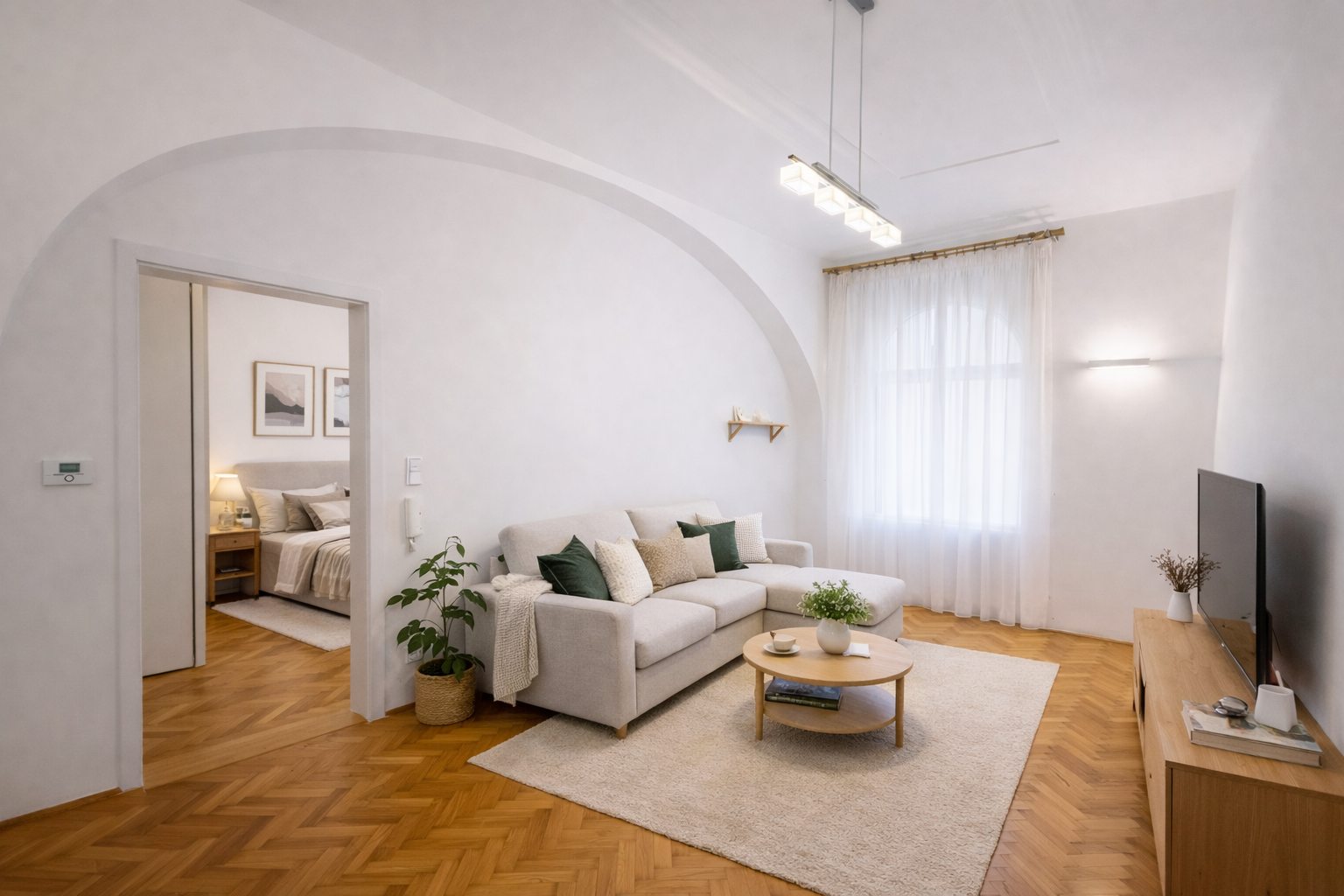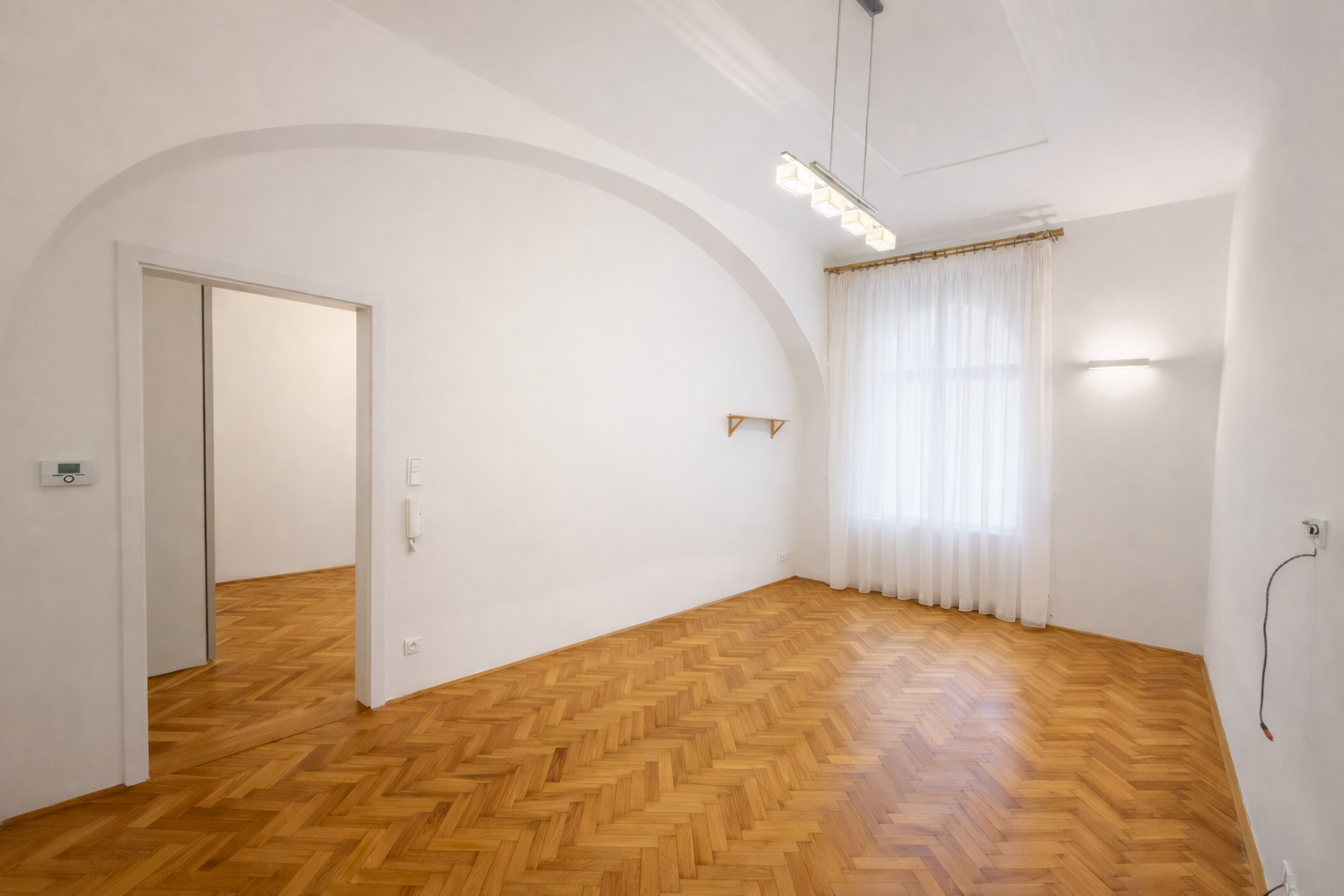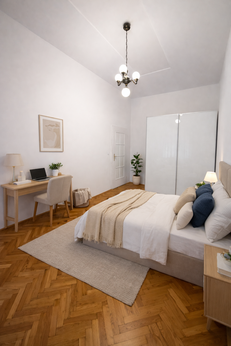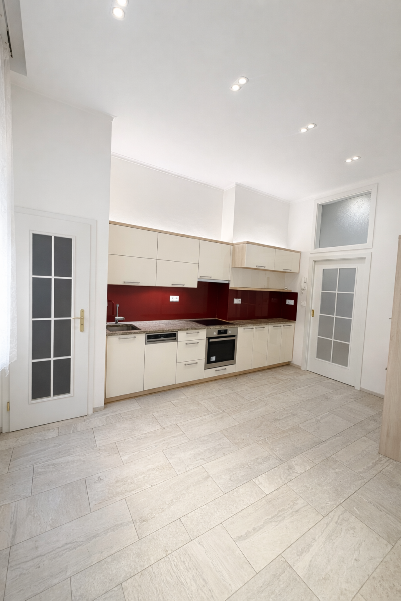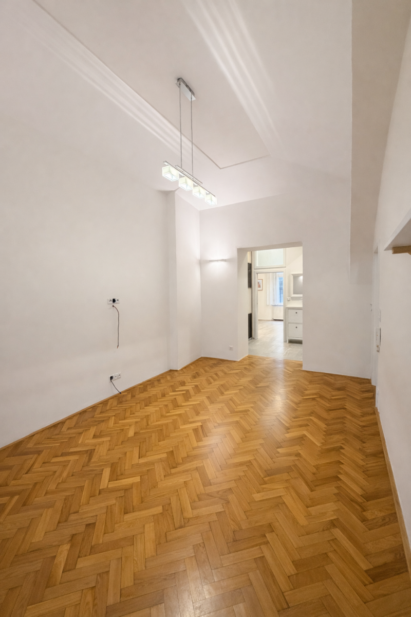 Interiér prošel citlivou a kvalitní rekonstrukcí s důrazem na detail, funkčnost a nadčasový design. Vysoké stropy dodávají prostoru vzdušnost, dřevěné parkety ve vzoru rybí kosti podtrhují charakter bytu. V ostatních částech je dlažba s podlahovým vytápěním. O tepelný komfort se stará vlastní plynový kondenzační kotel.