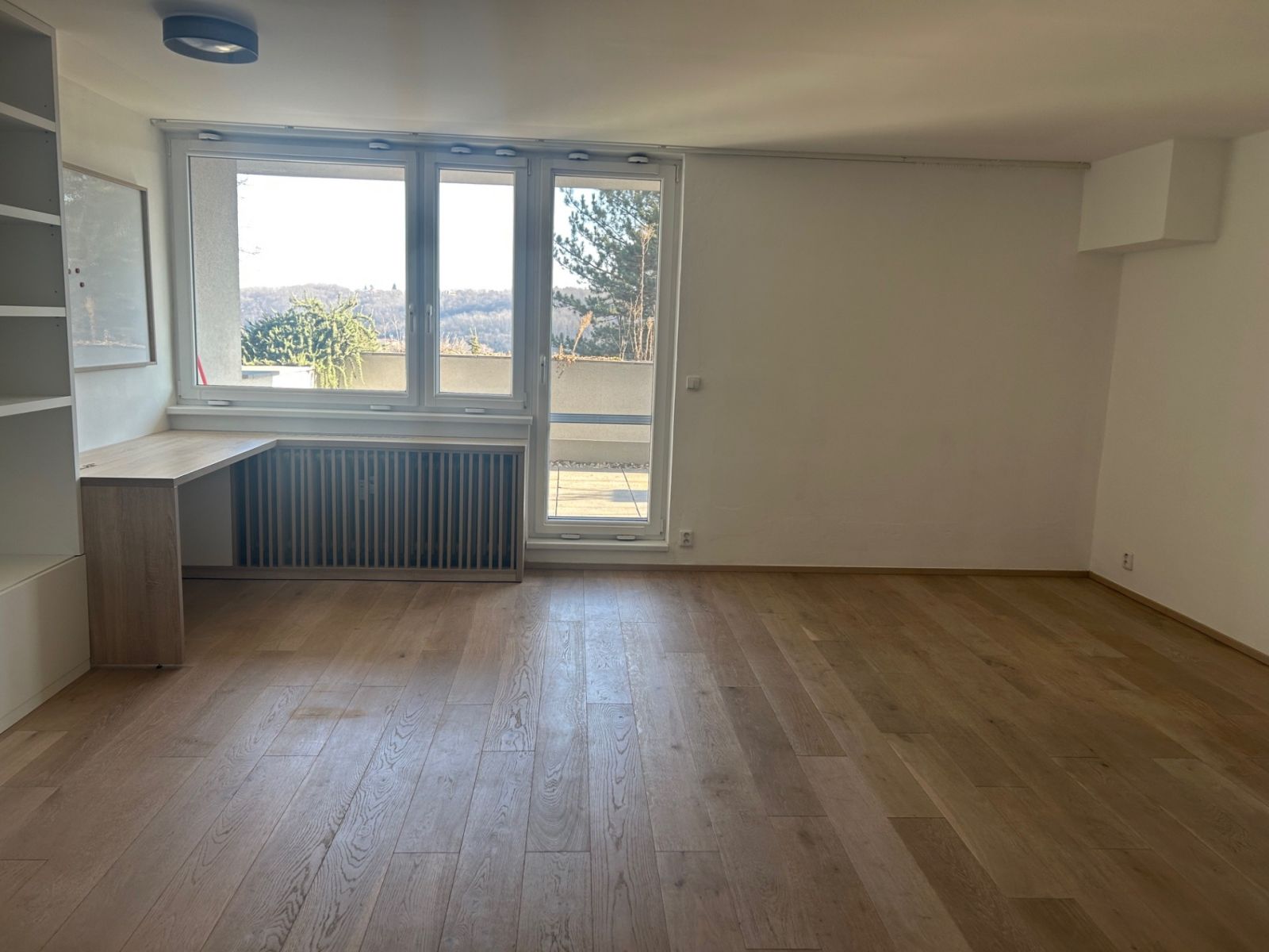 • Vestavěný policový díl a pracovní stůl v obývacím pokoji
