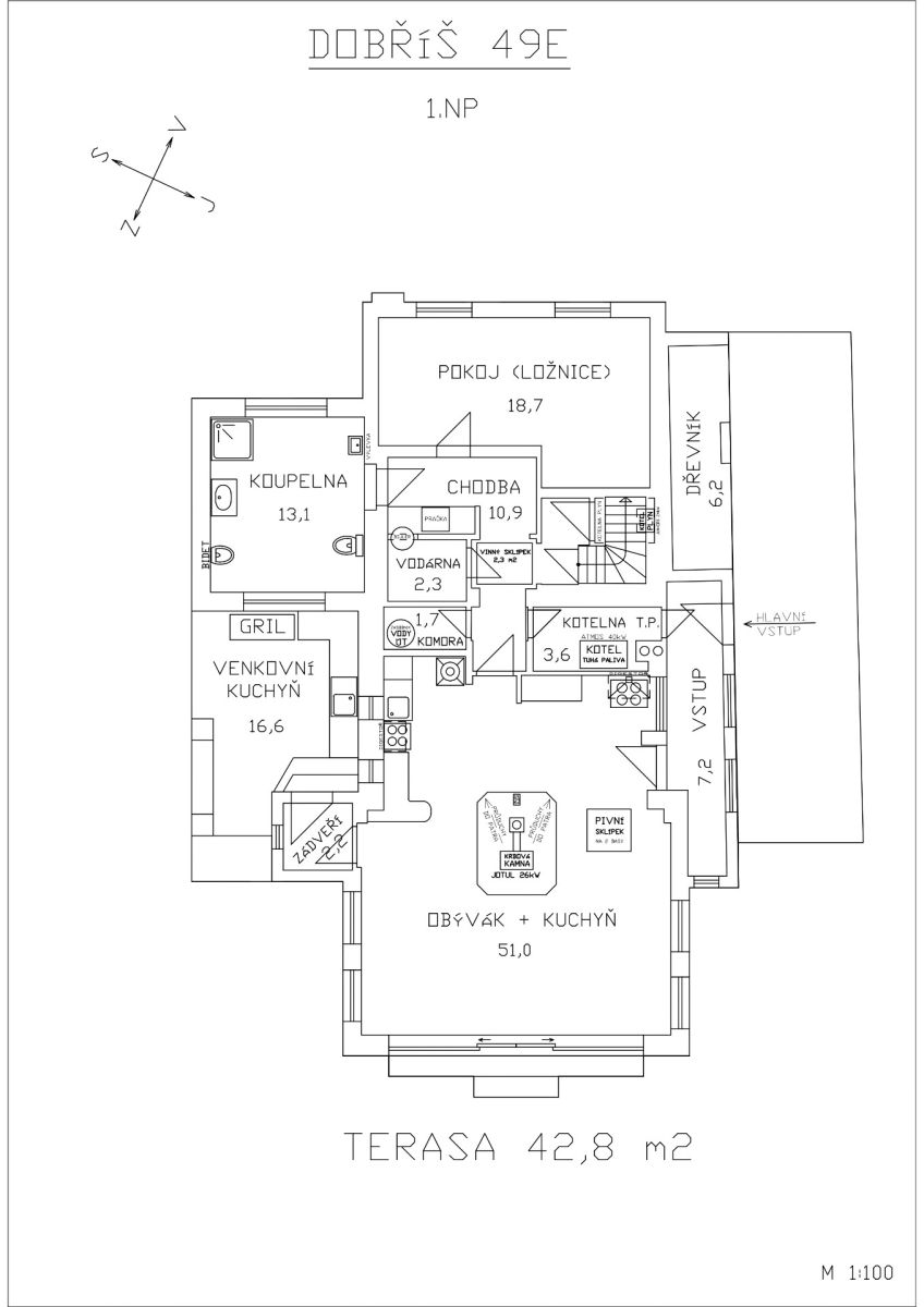 • velkorysá obytná místnost 51 m² + terasa 42 m² orientovaná na jihozápad,