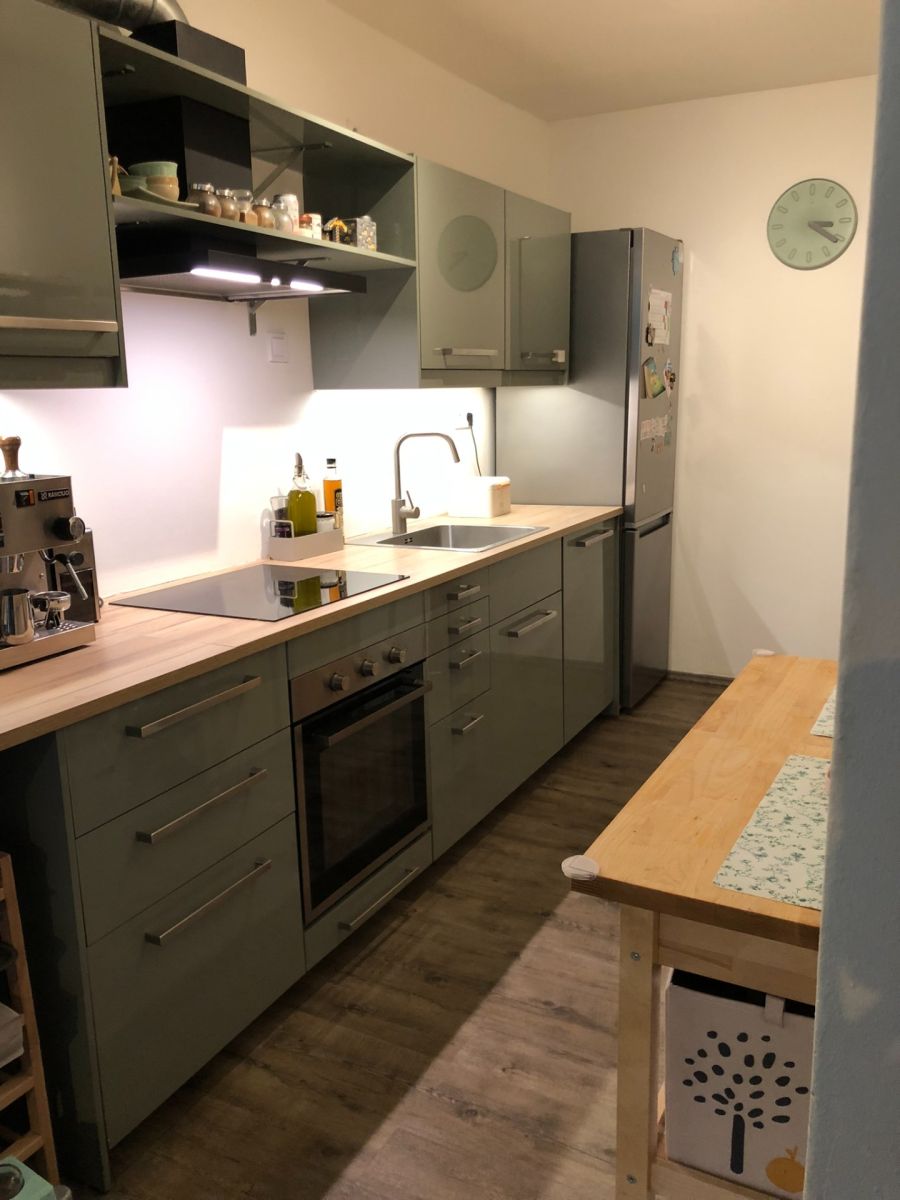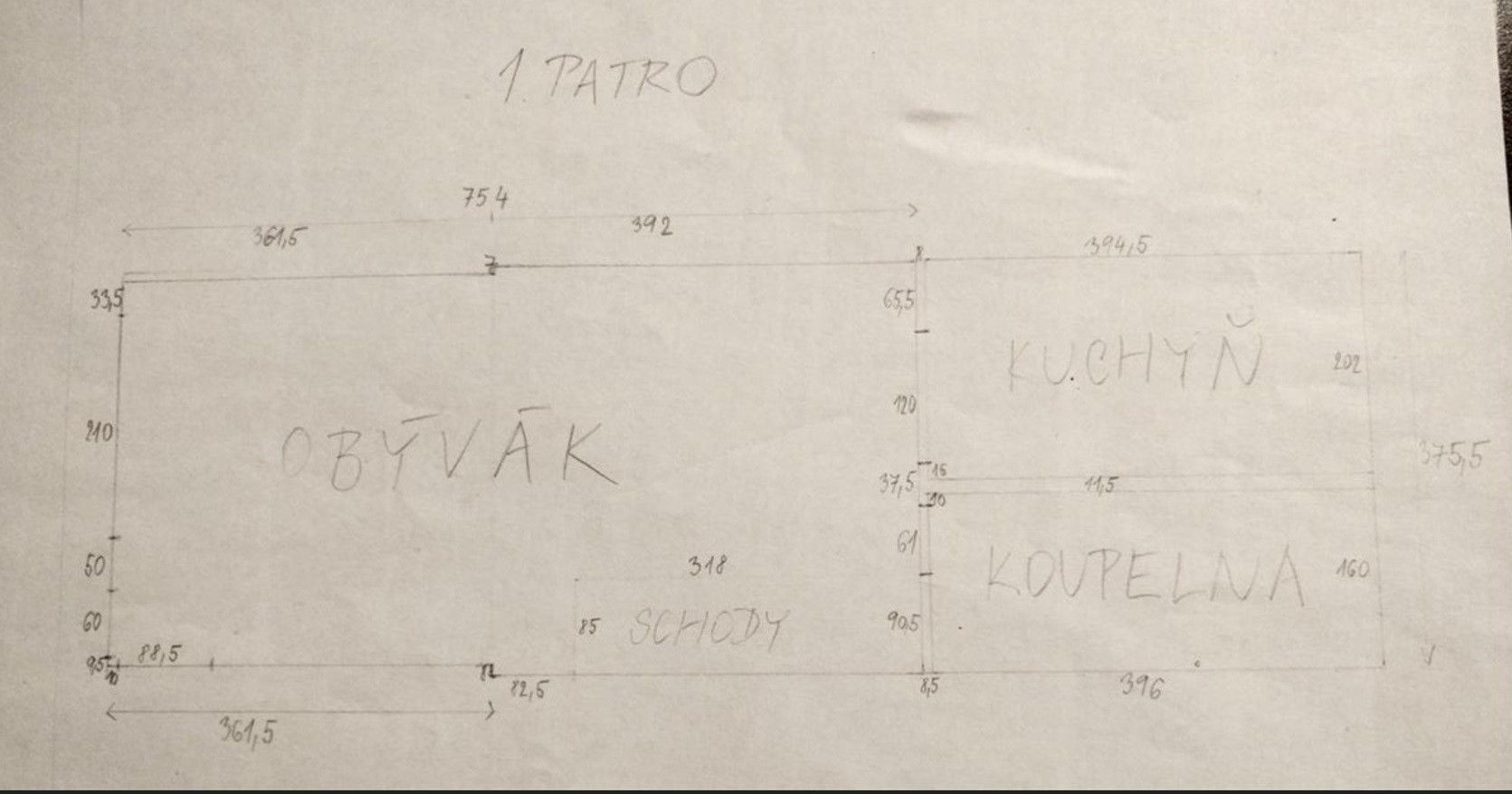 Vstup do bytu je z 1. patra, kde je prostorný obývací pokoj s částečně oddělenou kuchyní o velikosti cca 10 m2. Kuchyň je vybavena linkou s myčkou nádobí, sporákem se sklokeramickou deskou a troubou, lednicí a mrazákem. Lze ji oddělit jako samostatnou místnost a kuchyňský kout přesunout do obývacího pokoje. Vedle kuchyně je koupelna. Koupelna je vybavena vlastním bojlerem pro ohřev teplé vody. Na podlahách je vinyl a dlažba.