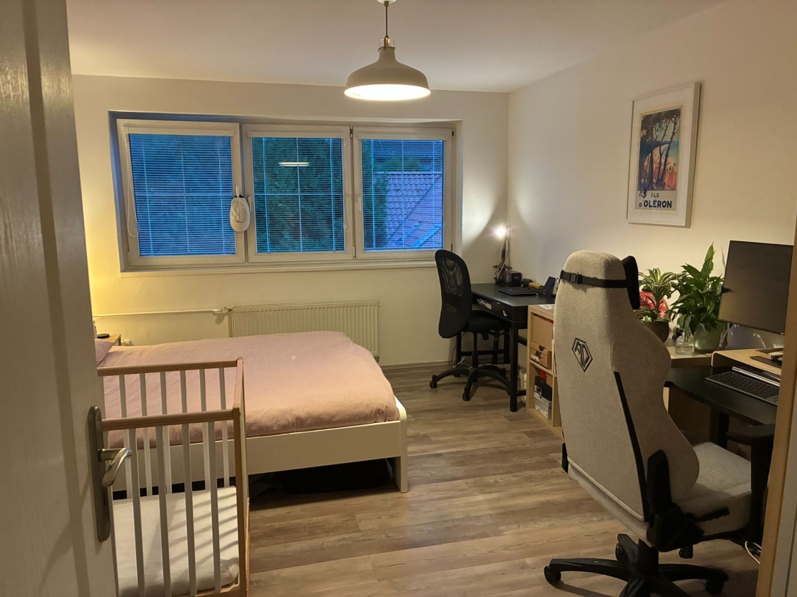 V patře jsou 2 ložnice o velikosti cca 18 a 12 m2, jedna z místností má v části zkosené stropy. Je zde i WC a komora, využívaná jako prádelna s přípojkami na vodu a odpad (jednoduchá změna na druhou koupelnu). Část chodby se dá využít např. k umístění knihovny.