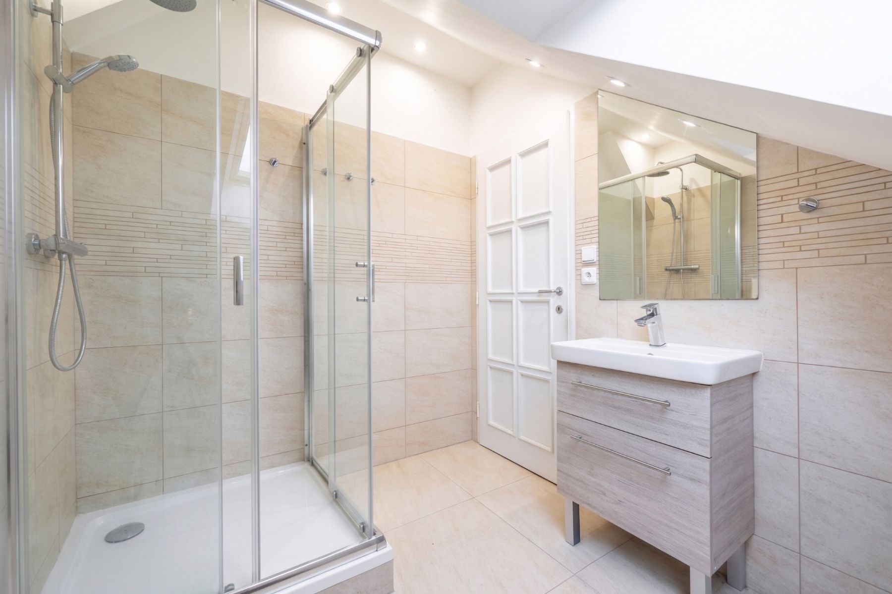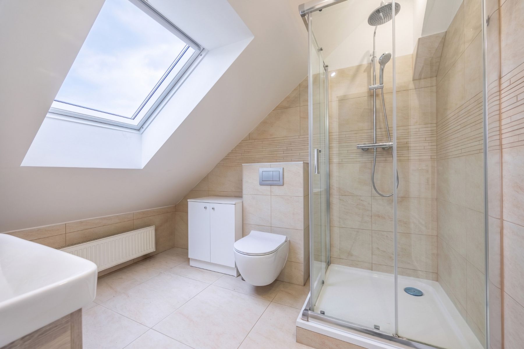 první koupelna se sprchovým koutem a toaletou