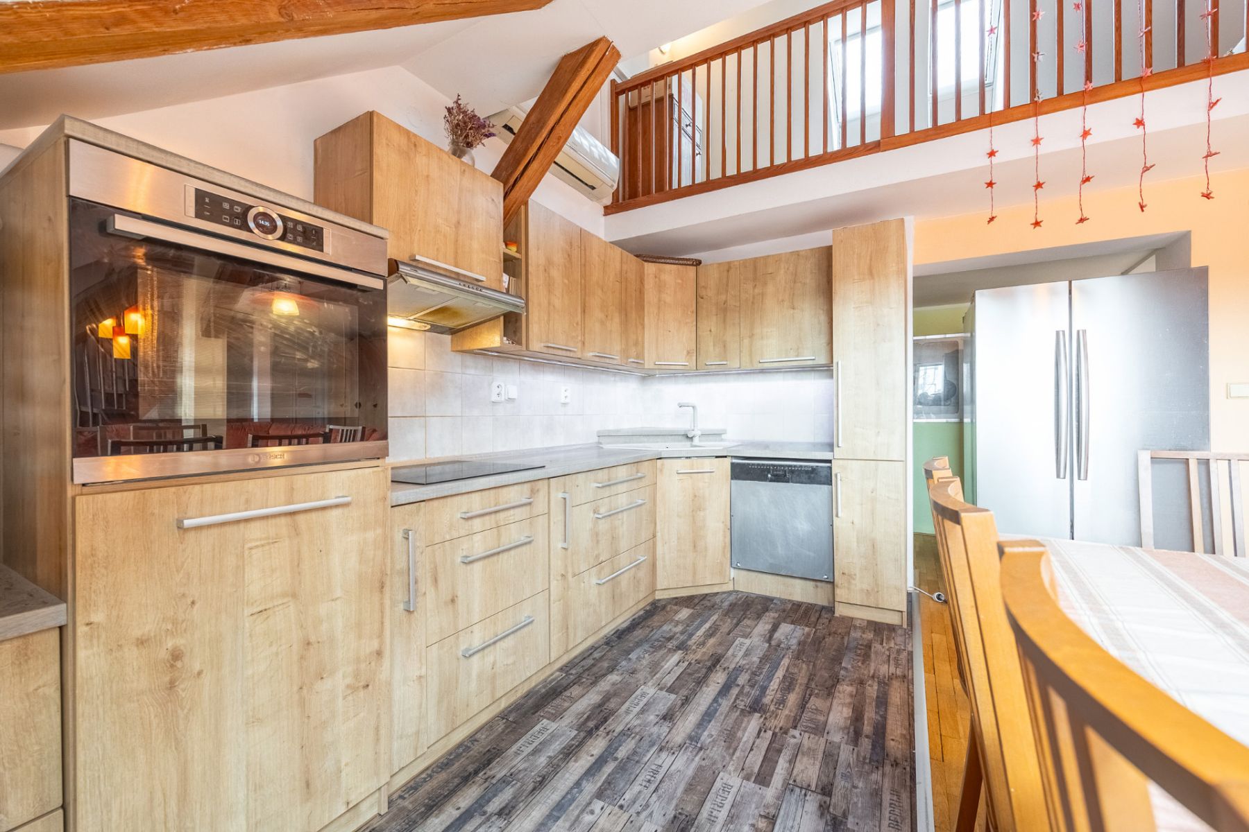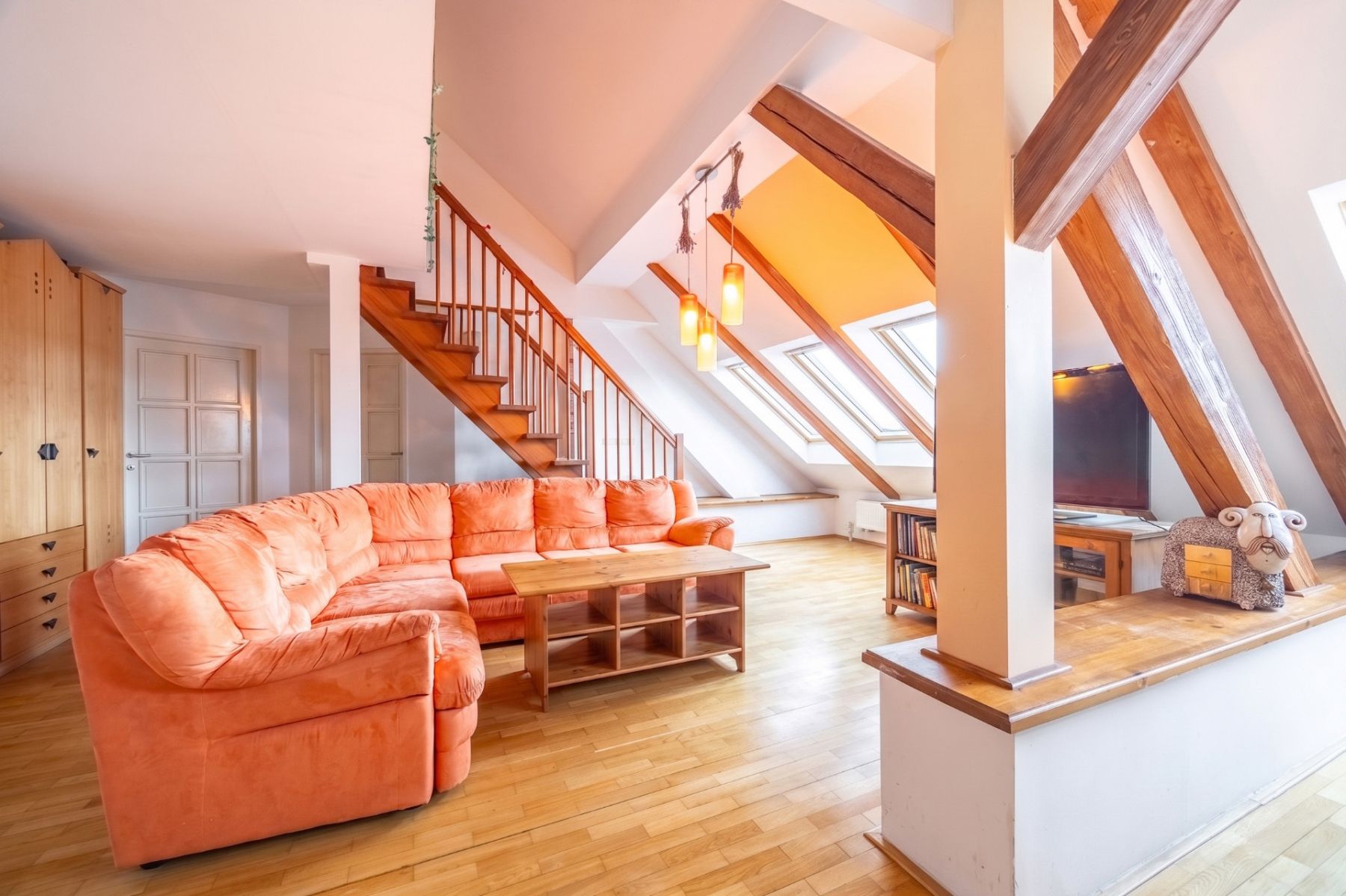 Dominantou bytu je velkorysý otevřený obývací prostor s kuchyní, který působí díky podkrovní architektuře mimořádně světlým a vzdušným dojmem. Otevřený strop, přirozené světlo a plynulé propojení jednotlivých částí vytvářejí ideální místo pro rodinný život i reprezentativní setkávání s přáteli.