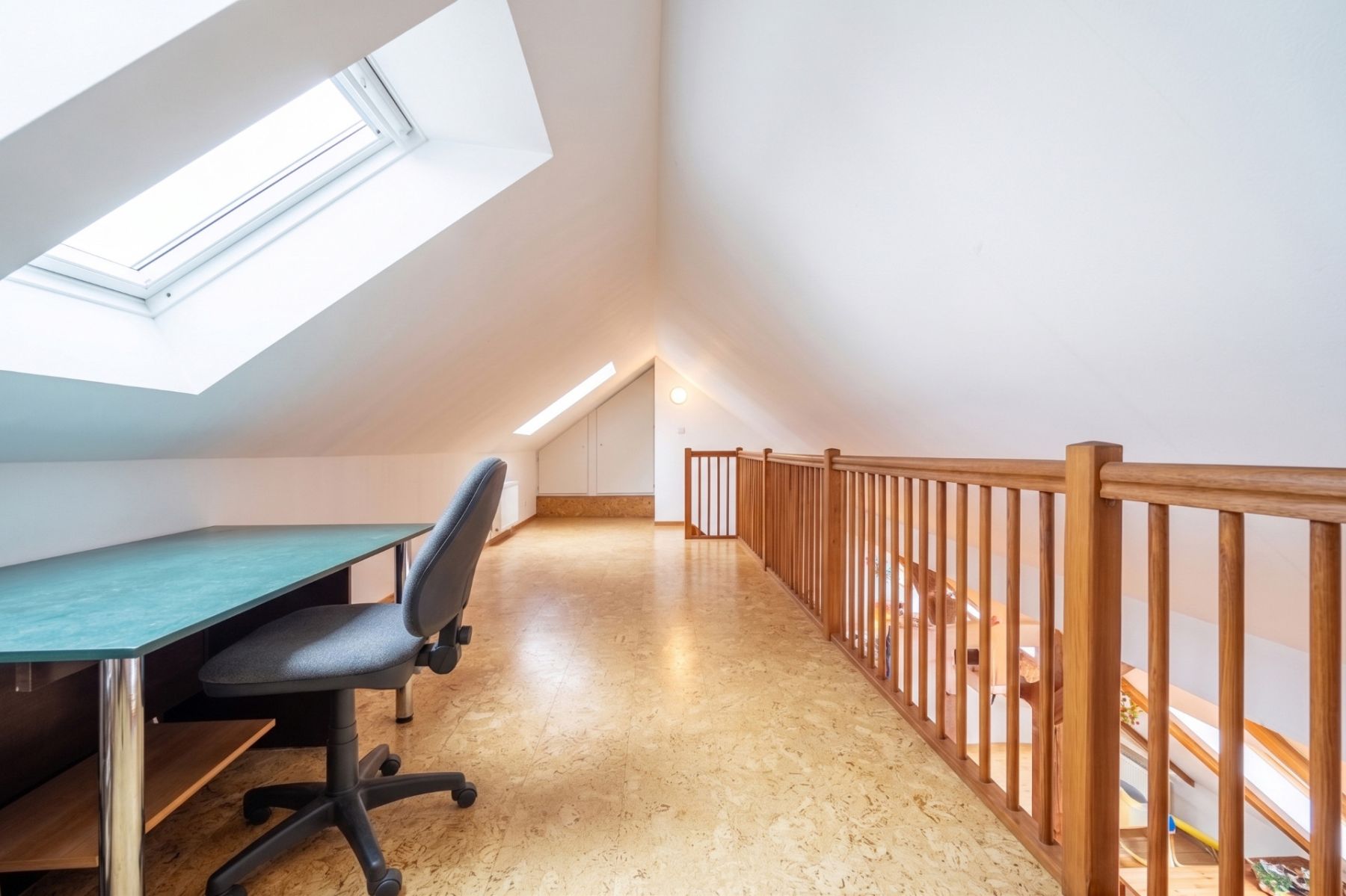 Z obývací části vede schodiště do dalšího otevřeného patra, které nabízí flexibilní využití – pracovní zázemí, relaxační zónu, hernu nebo další úložné prostory. Na tomto patře se nacházejí také dvě praktické komory.