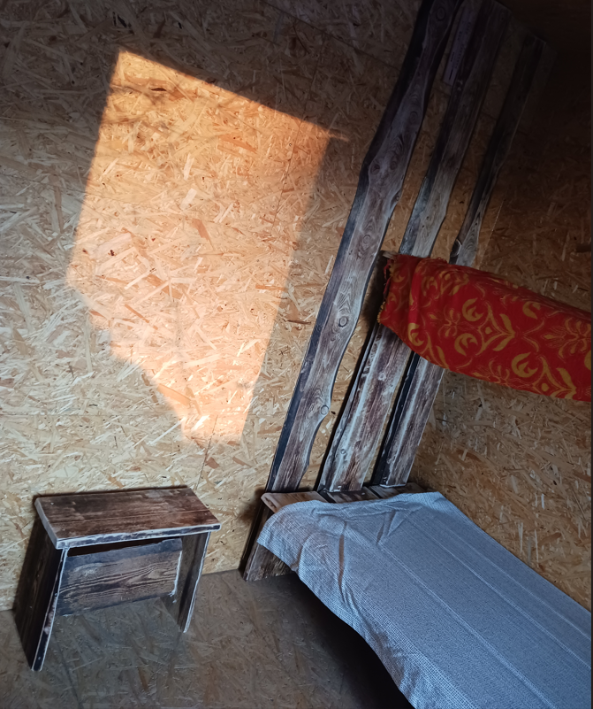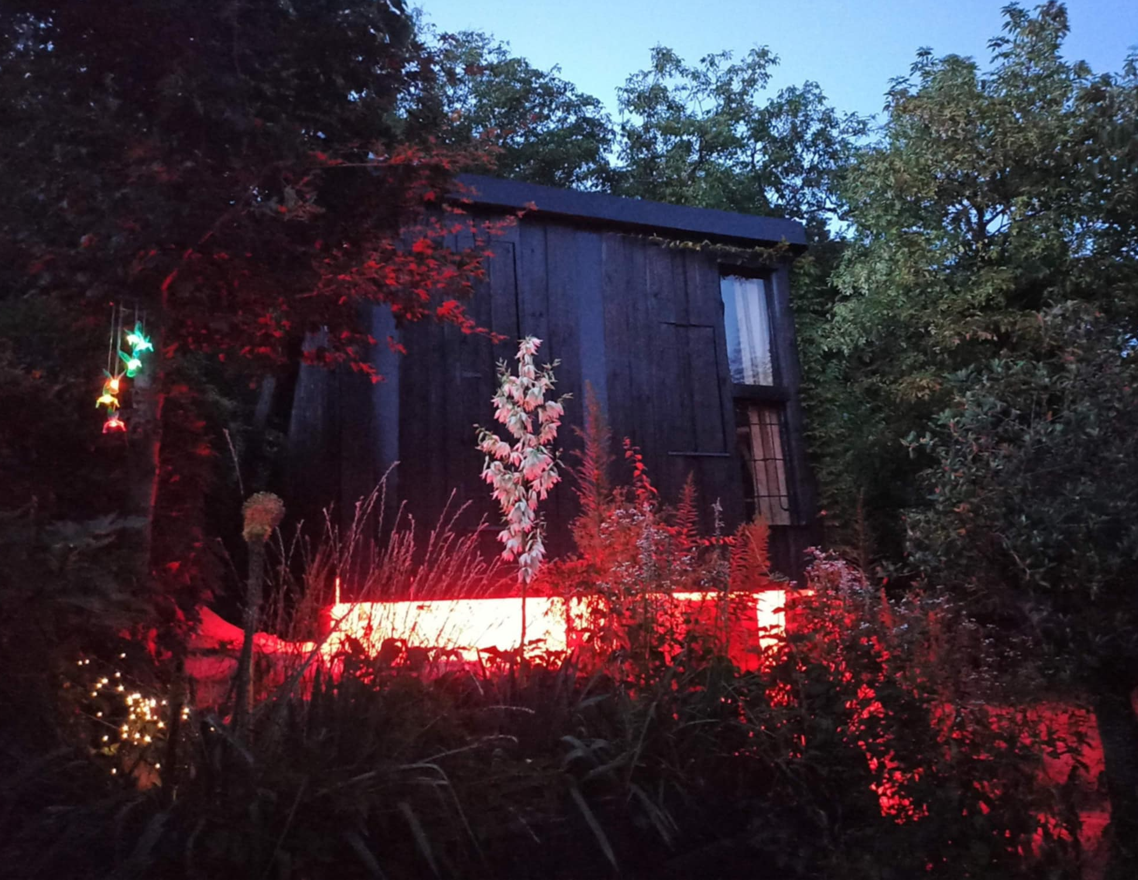 Elektřina - ostrovní solární systém s baterií. Vnější LED osvětlení (pohybové senzory), vnitřní LED osvětlení na dálkové ovládání + zásuvka na 220V + 3x USB. Na zahradě je vodovod (osada na zimu vypíná); Samostatné chemické WC.
