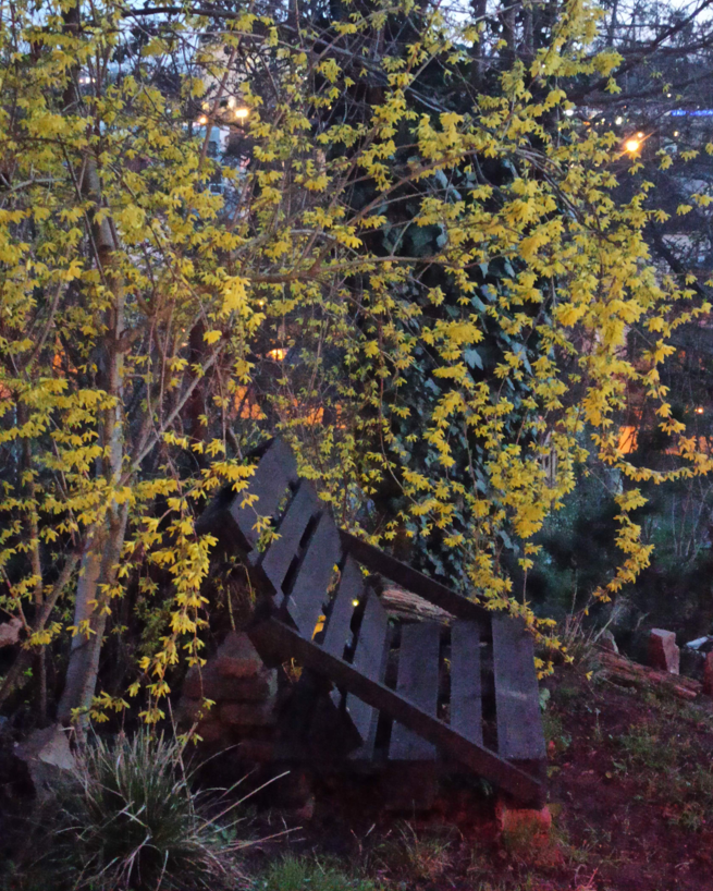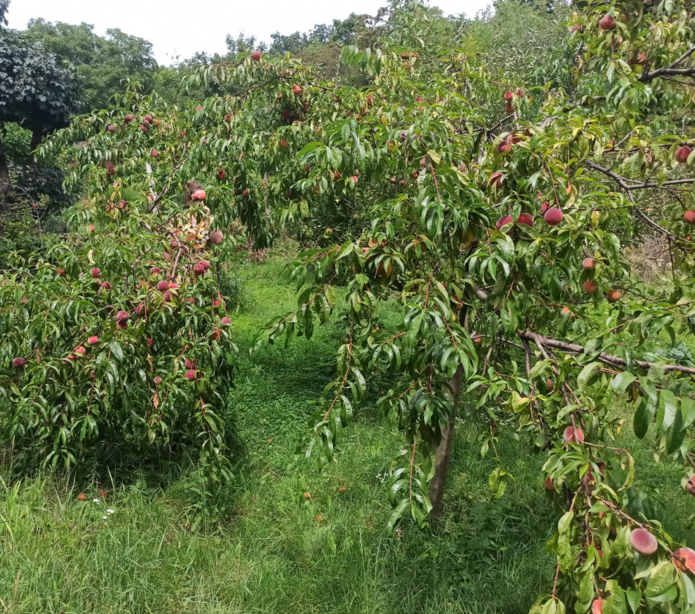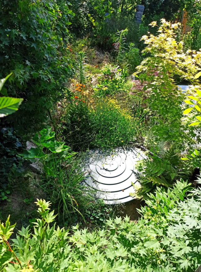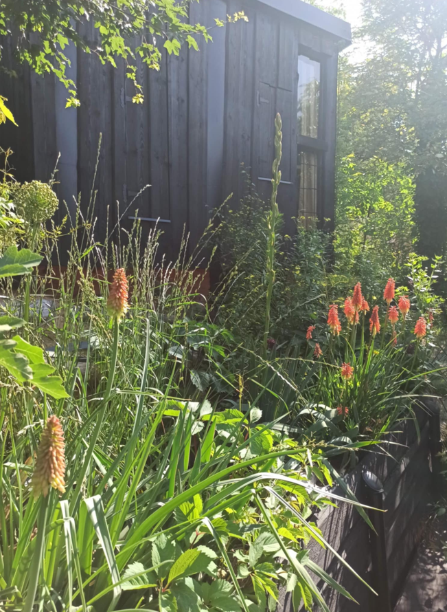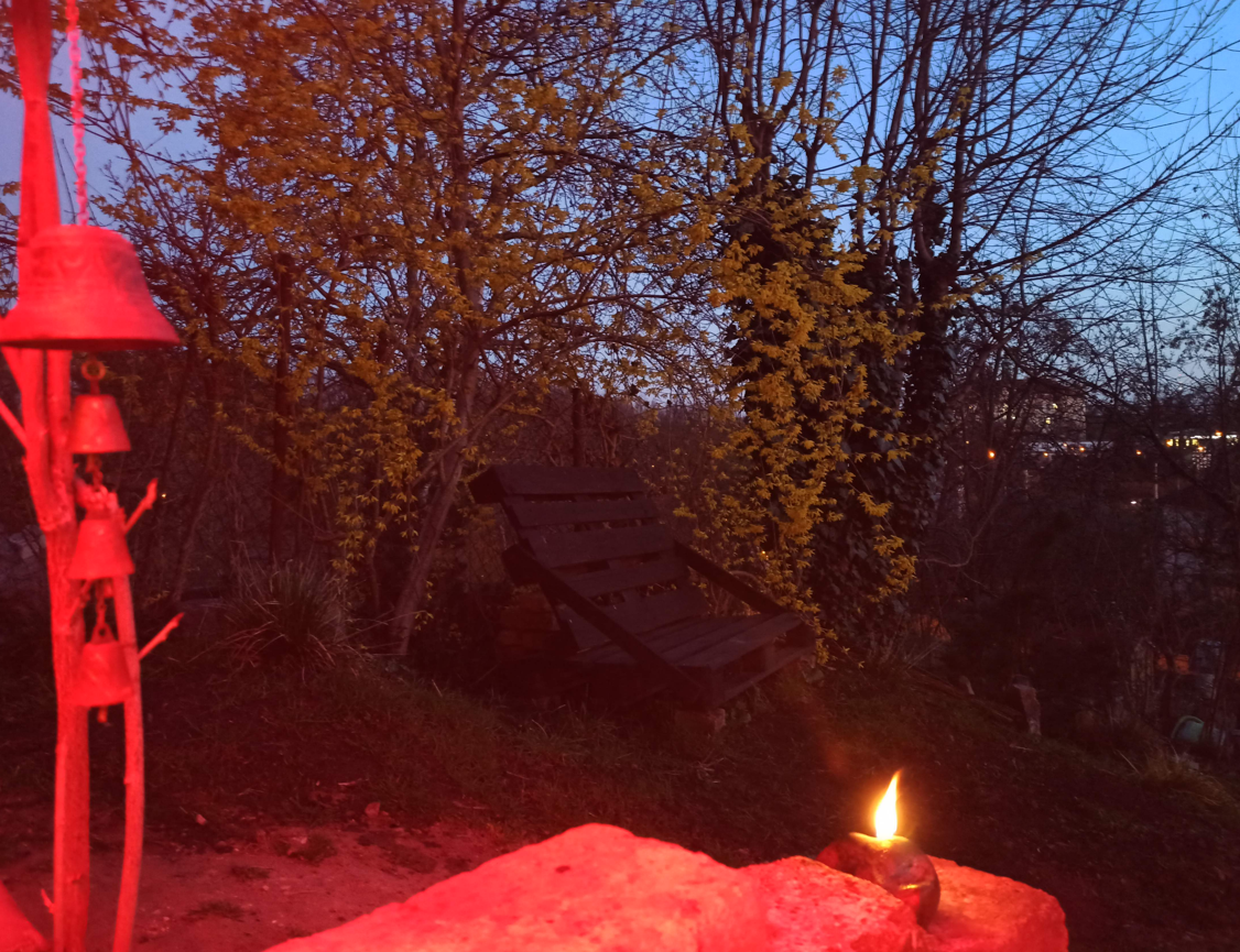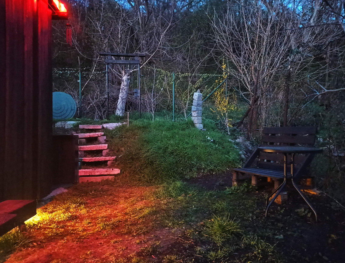 Udržovaná zahrada - v horní části pozemku, od lesa - japonský styl (zejména japonské javory, magnolie, popínavky), plastová koupací nádrž 500 l + dvě malá jezírka na zachytávání dešťové vody ze střechy (vodní květiny). Pod chatou - stepní zahrada, další koupací nádrž 500 l, + menší nádrž na lekníny+rybky. Ve střední části zahrady - posezení u ohniště, houpačka. Spodní cca polovina zahrady - ovocný sad (plodící broskvoně, meruňky, jabloně, třešně … rybízy, angrešty, rakytníky, goji atp.) + luční květy, tráva, záhony.