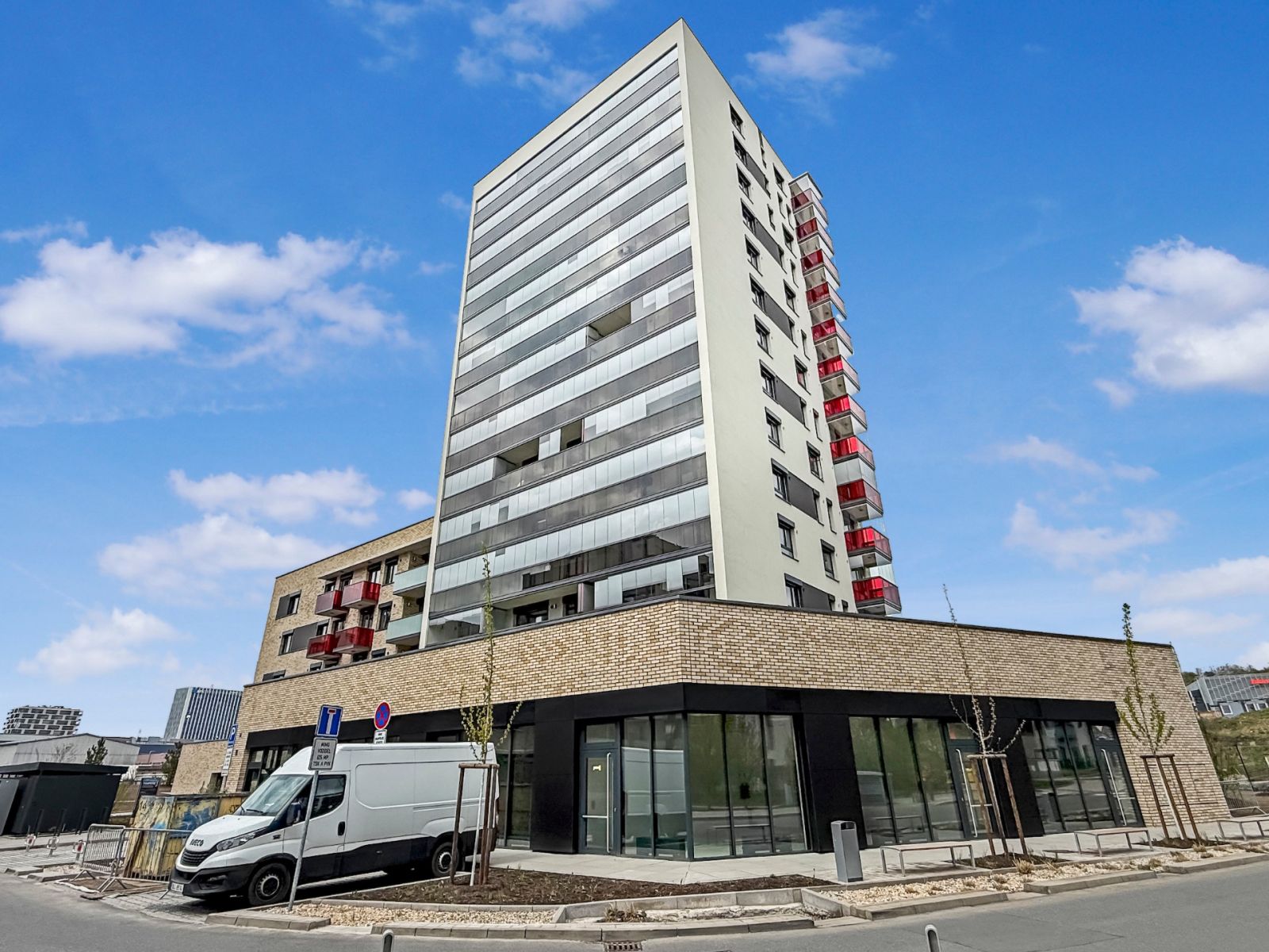 The building is low-energy (PENB class B), barrier-free, with fast lifts. Bike room, pram room, and a washing zone for bikes and dogs. EV charging stations by the building.