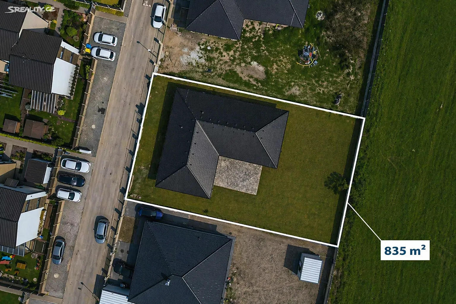 Pozemek o velikosti 835 m² nabízí dostatek soukromí i prostor pro relaxaci.