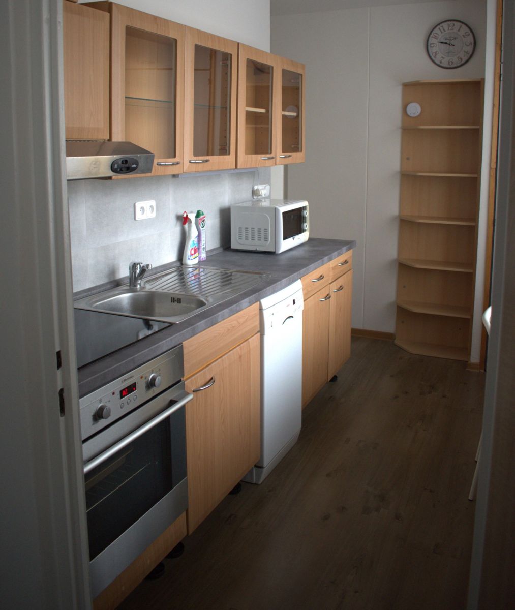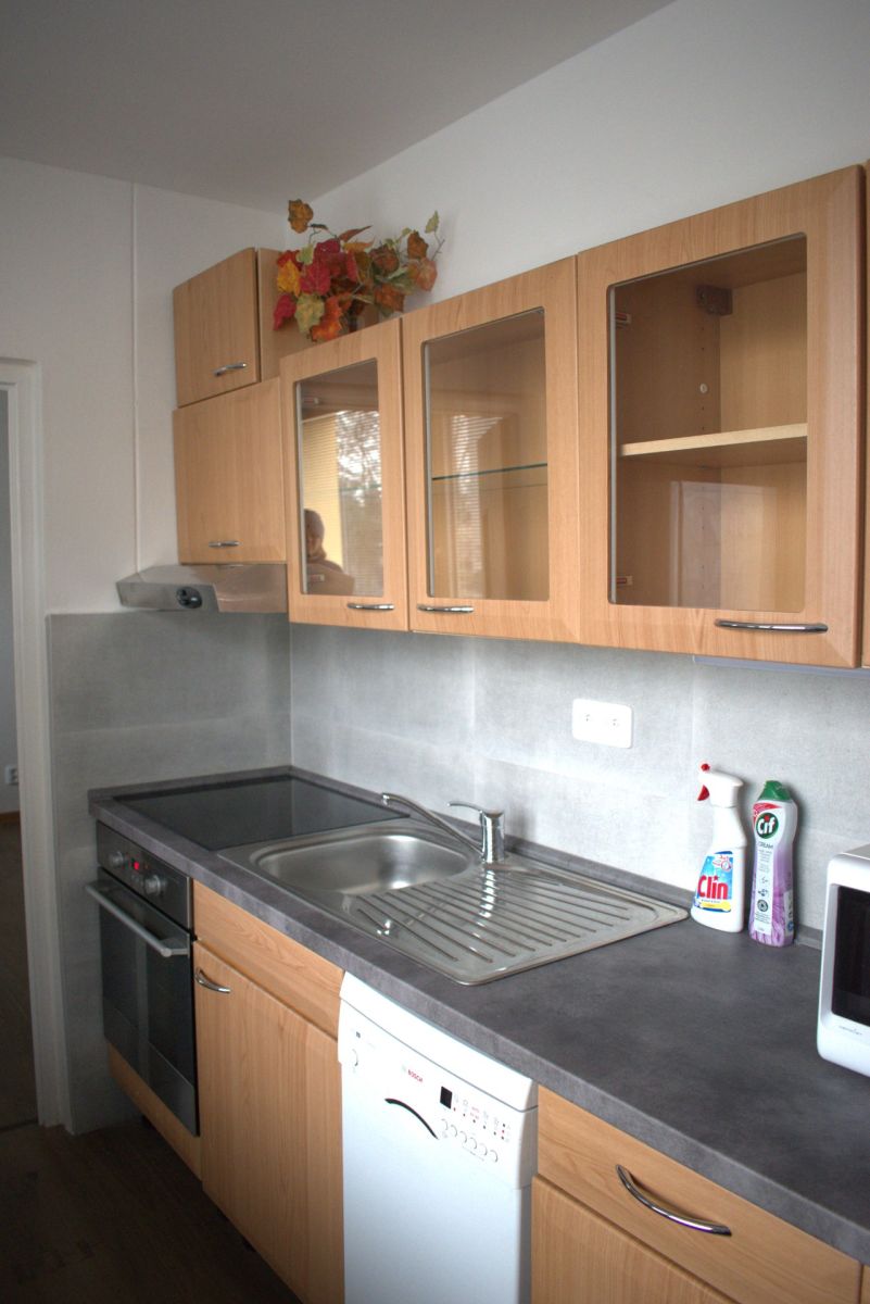 Kuchyňská linka je vybavena dřezem, baterií, myčkou, indukční varnou deskou, troubou, digestoří a kombinovanou lednicí. Z ložnice je vstup na lodžii. Koupelna je vybavena sprchovým koutem, WC, umyvadlem se skříňkou. V bytě jsou plastová okna+ horizontální žaluzie, nové podlahy-zátěžové lino, dálkové vytápění – parovod.