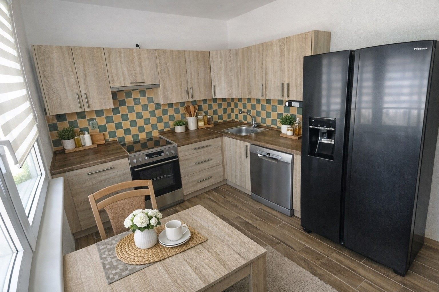 Dispozice zahrnuje velký obývací pokoj, samostatnou jídelnu, prostornou kuchyň, ložnici a další dva pokoje. Kuchyň je plně vybavená americkou lednicí, myčkou a sporákem s troubou. Koupelna je se sprchovým koutem, WC je samostatné.