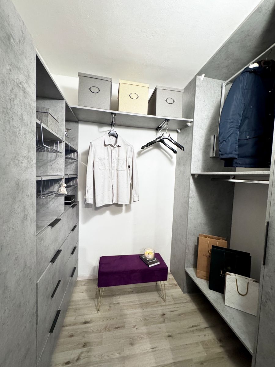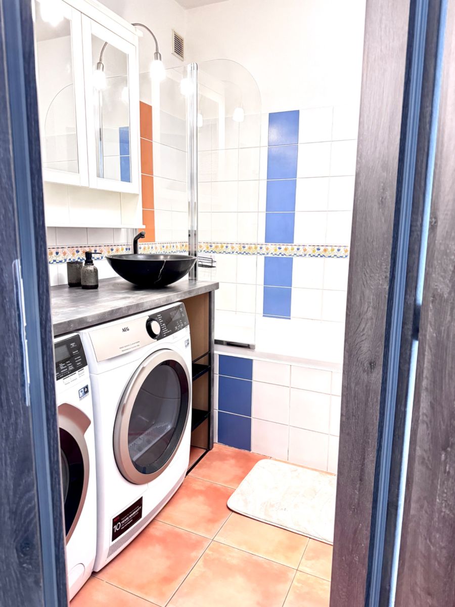 Byt je částečně vybaven: kuchyně (sklokeramická varná deska, trouba, lednice s mrazákem, myčka, nádobí, jídelní stůl se židlemi), obývací pokoj (TV, stolek, pracovní kout), ložnice (manželská postel s úložným prostorem, skříň), dětský pokoj (postel, stůl, židle), šatna (vestavěné skříně). V koupelně je k dispozici pračka a sušička. Lodžie je zastřešená a vybavená venkovním nábytkem, ideální pro relaxaci.