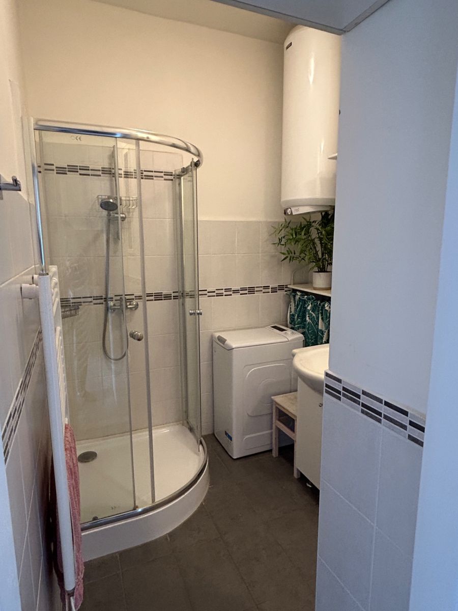 Součástí vybavení je kuchyňská linka s plynovým sporákem a základní nábytek viz fotografie (byt je kompletně vybavený, včetně postele, pračky, či lednice, nic ze zobrazeného není nutné v bytě ponechat, záleží na domluvě). Jedná se o světlý střešní byt vhodný pro jednu až dvě osoby s unikátním výhledem a nadstandardním venkovním prostorem.