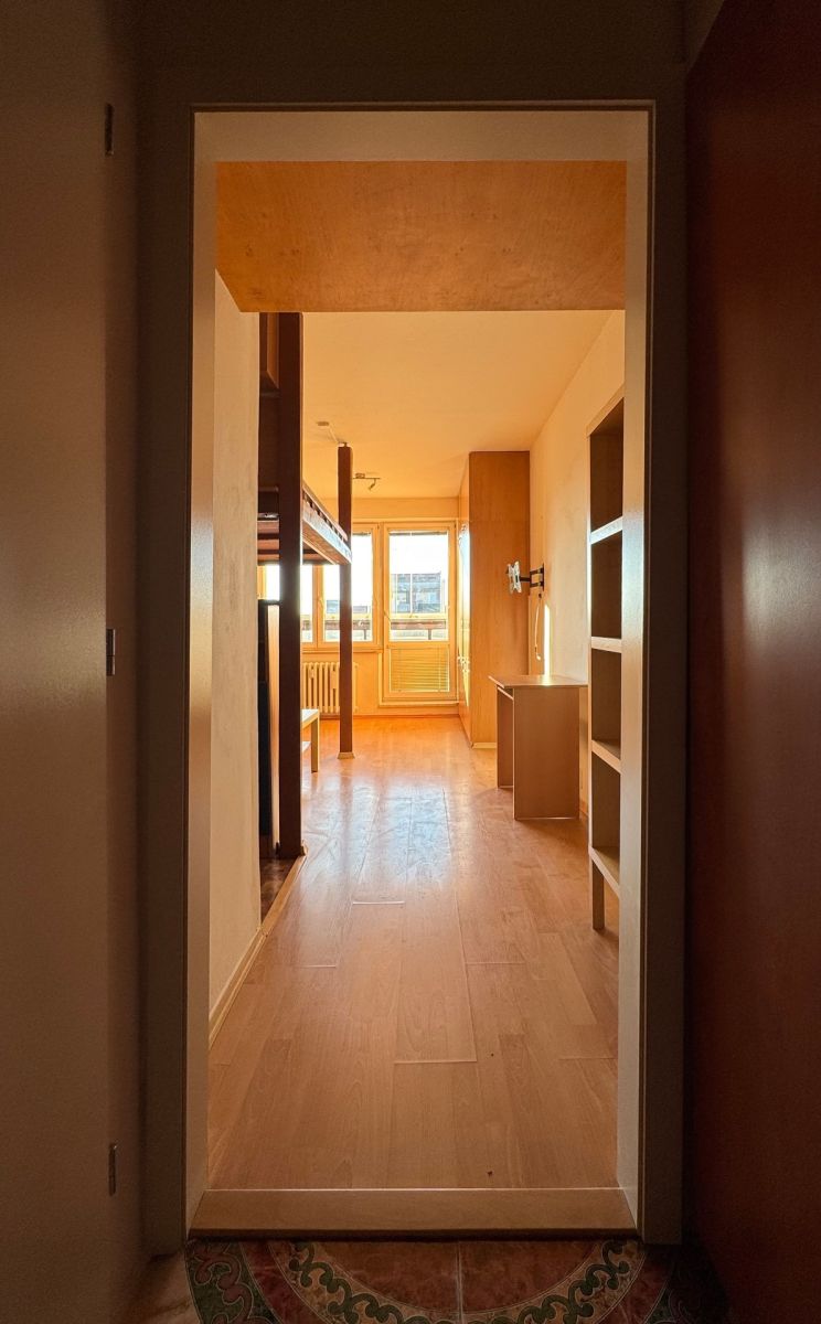In a revitalized projects block we are renting a one-room flat. There's a built-in dresser and tile floor in the ante-room. The bathroom and toilet is original, but refurbished, there's a small bath, washing machine and furniture in the it. In the kitchen section there's a fridge with a separate freezer, double hotplate and a small oven, a microwave oven and lino on the floor. The living part with a floating floor is furnished with more storage features (built-in dresser, shelves etc.). There's no TV, just the sockets for connection. The bed for two is a bunk one, accessed over solid stairs under which there is more storage. Under the bed there's an expendable sofa with yet extra space inside and a small table with 2 chairs. The balcony is closed by a glass wall, with lino on the ground.