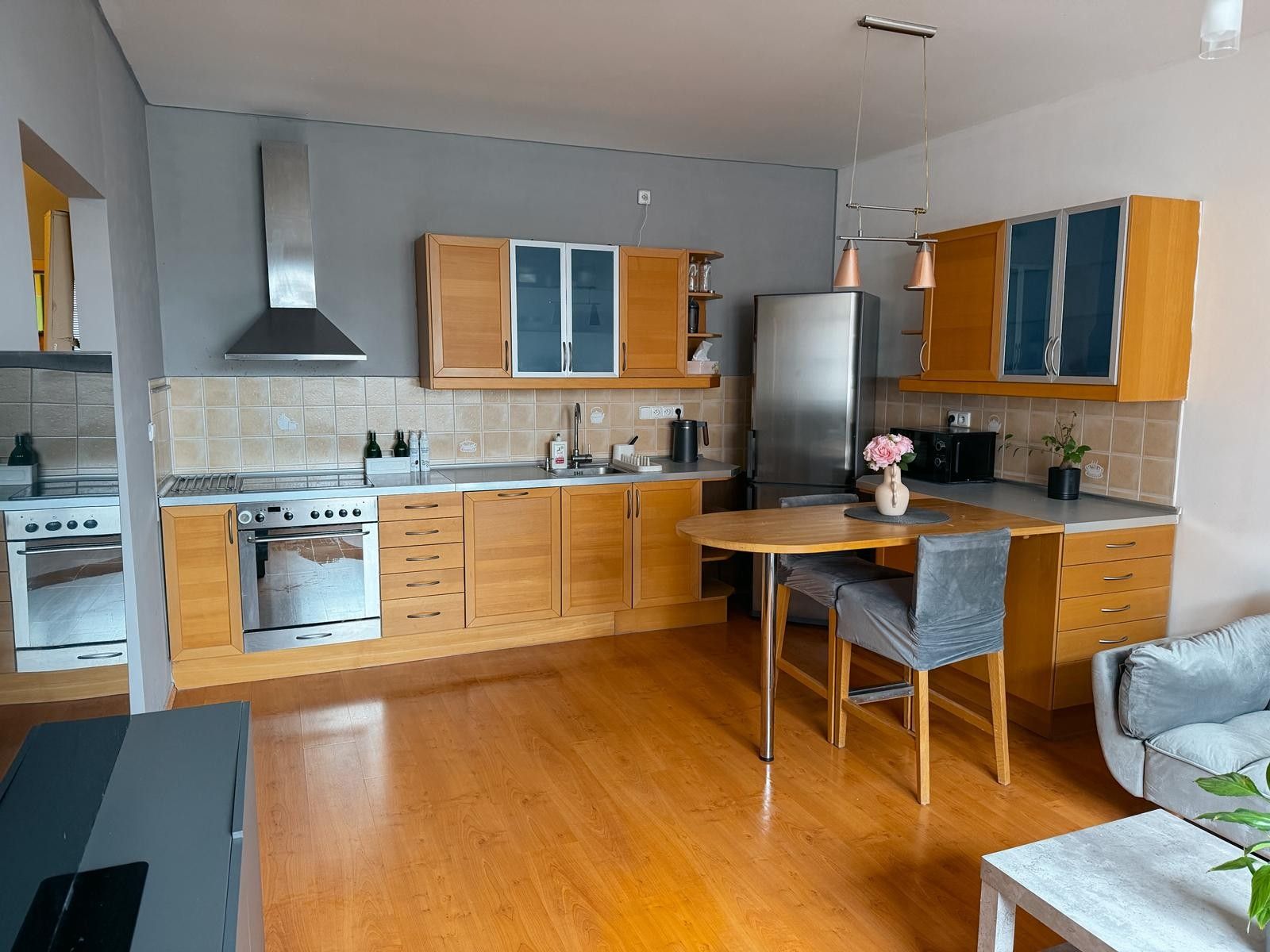 Byt je částečně vybavený: pohovka, postel, komody, konferenční stolek, pračka, koupelnový nábytek, kuchyňská linka včetně sporáku se sklokeramickou deskou, horkovzdušnou troubou, vestavěnou myčkou, lednicí a mrazákem, barové židle ke stolu. Televize není součástí.