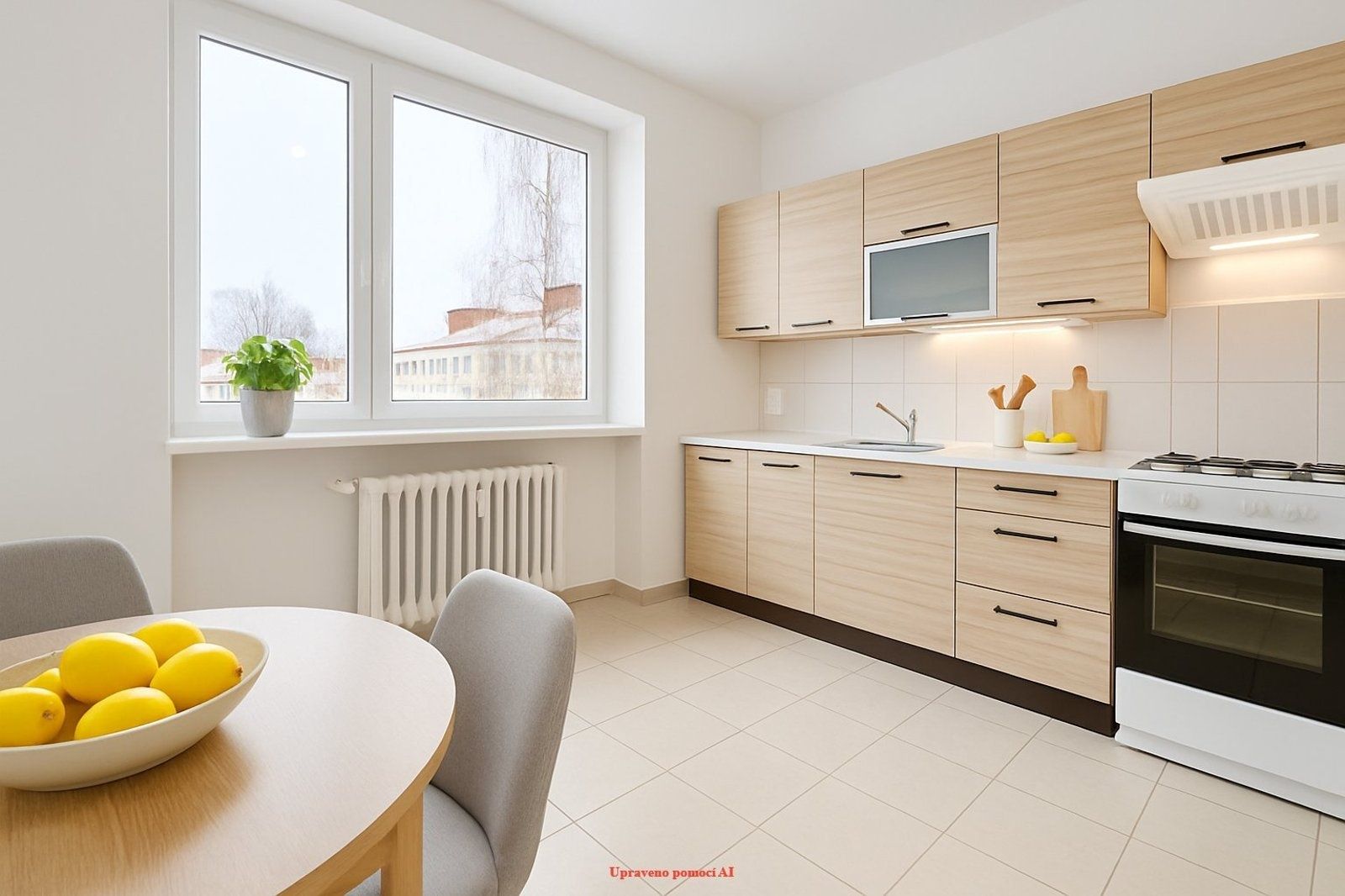 Byt prošel pečlivou rekonstrukcí a působí svěže, čistě a moderně. Už vstupní hala se světlou dlažbou navozuje pocit vzdušnosti a elegance. Na ni navazuje kuchyně s pěknou kuchyňskou linkou v dekoru dřeva, která dodává interiéru teplo a útulnost. Samozřejmostí je plynový sporák a dostatek pracovního i úložného prostoru.