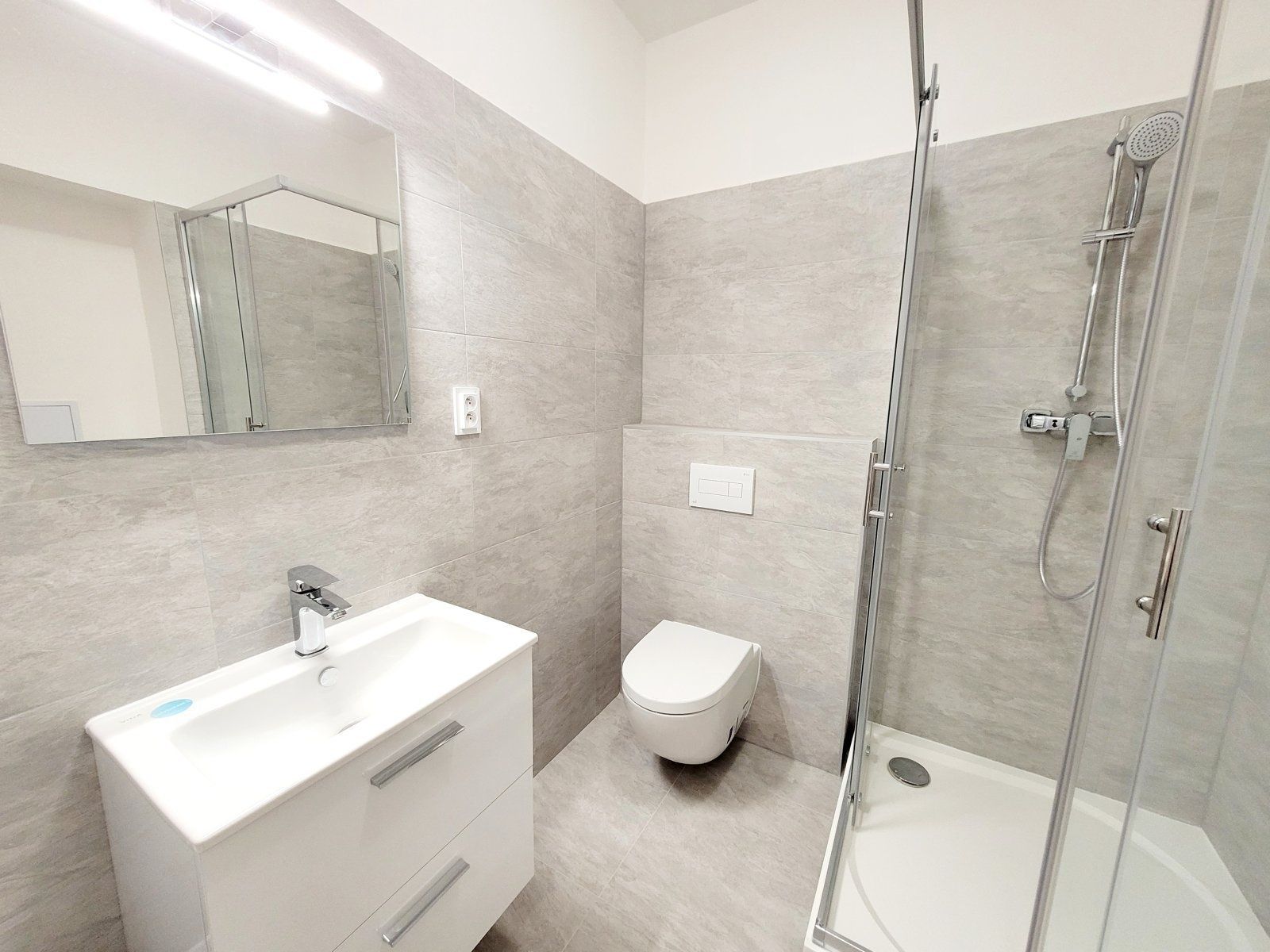 Koupelna s prostorným sprchovým koutem je po krásné rekonstrukci se světlem na zrcadle, moderní koupelnovou skříňkou, topným žebříkem a velmi pěknou podlahou.