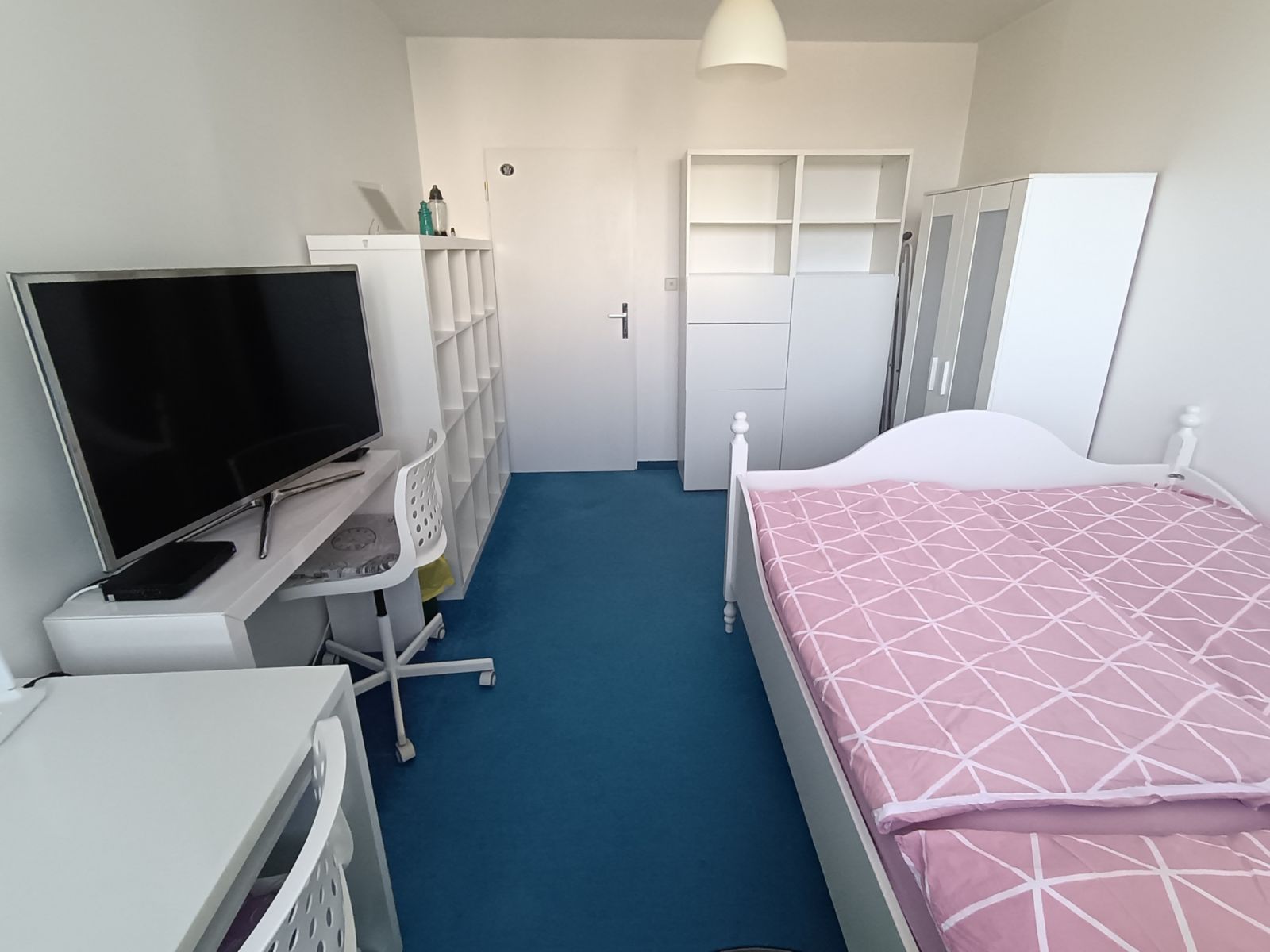 Bílý pokoj v Praze 5. Hezký pokoj v klidné, moderní, čisté a bezpečné části Prahy. Dům stojí na rohu náměstí 2 minuty pěšky od zastávky tramvaje, 1 minutu je vzdálen supermarket, restaurace a další menší obchody. Dobré spojení do centra, cca 25 minut tramvají, nebo s přestupem na metro. Tramvaje jezdí ve špičce každé 2 minuty, v noci cca po 20 minutách. V blízkosti je příroda, Aquapark 10 minut pěšky. Spolubydlící jsou milí, tiší, pracující cizinci, kteří jsou celý den v práci, přicházejí pozdě večer a ani o nich nebudete vědět. Můžete si popovídat a zeptat se na cokoliv, rádi se vším pomohou. Byt má 4 pokoje, v každém bydlí 1 osoba. Kuchyň je vybavená nádobím, které můžete používat k vaření. Pračka je k dispozici v koupelně, rovněž je možno použít žehličku a žehlící prkno, nebo sušák na prádlo, které jsou k dispozici ve skříni na chodbě. Wifi je samozřejmě také k dispozici, heslo je v kuchyni, rychlost 150mgb/s.