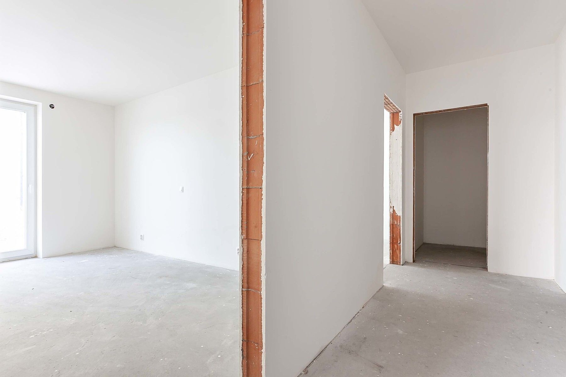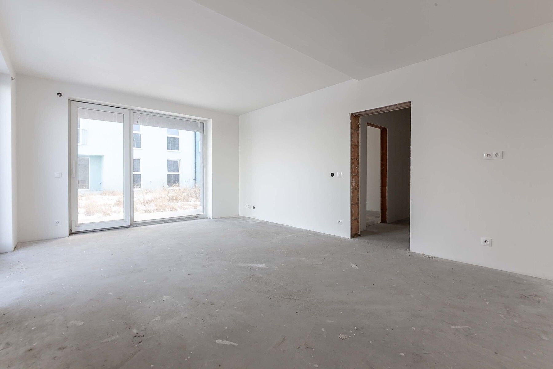 Byt je ve stavu před dokončením - koupelna je již kompletně dokončena, podlahy a interiérové dveře nejsou instalovány, což dává budoucímu majiteli možnost dokončit interiér dle vlastních představ.
