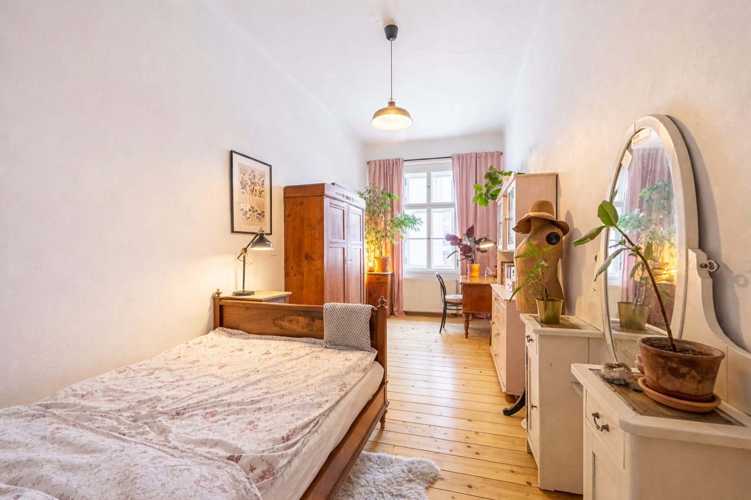 Interiér vás okouzlí zachovanými původními prvky – vysokými stropy, špaletovými okny, dvoukřídlými dveřmi, mosaznými klikami a krásnými dubovými parketami. Dominantou bytu jsou funkční krbová kamna, která vytvářejí skutečné teplo domova a podtrhují jedinečný charakter prostoru.