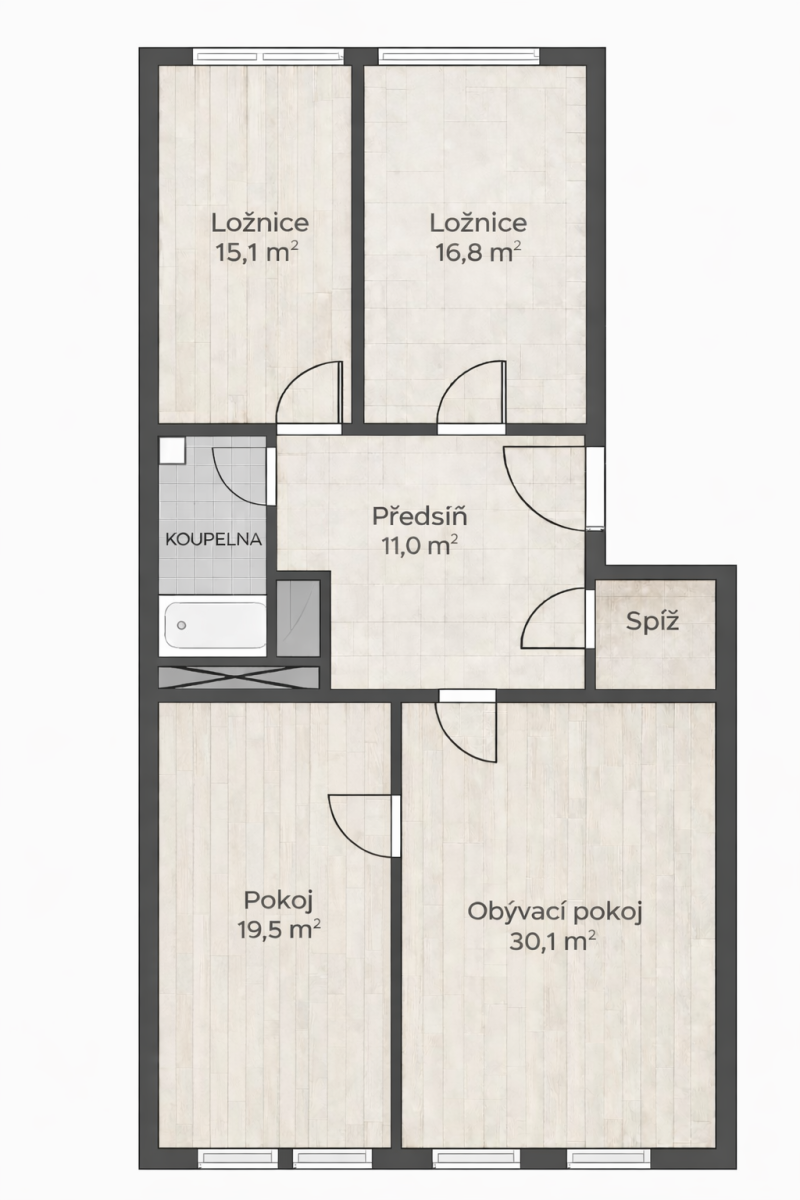 Pokoje jsou neprůchozí. Koupelna a WC jsou oddělené a v koupelně vás potěší komfort dvou umyvadel a vany. V mezipatře je pro vás k dispozici balkón. V bytě je praktická spíž, kterou je též možné využít jako šatnu. K bytu náleží uzamykatelná sklepní kóje. Plánovaná je výstavba výtahu.