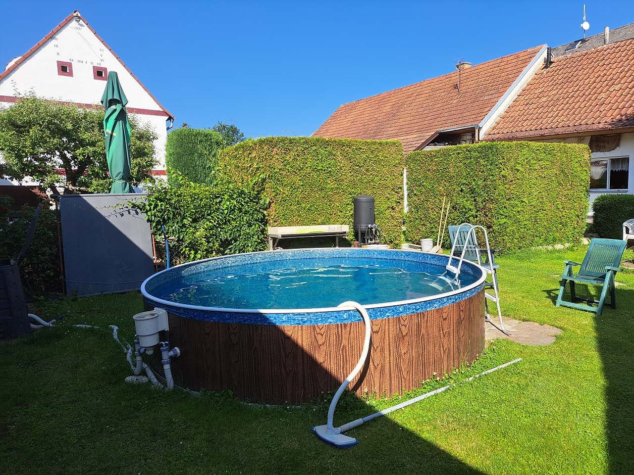 Stylová chalupa o čtyřech místnostech v přizemí, kuchyní, obývacím pokojem a dvěma ložnicemi, WC, koupelnou a verandou s letním posezením. Velký uzavřený dvůr, bazén