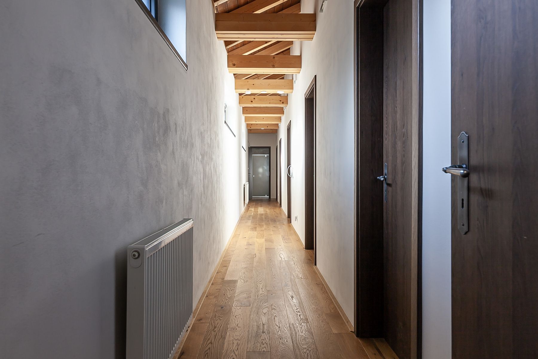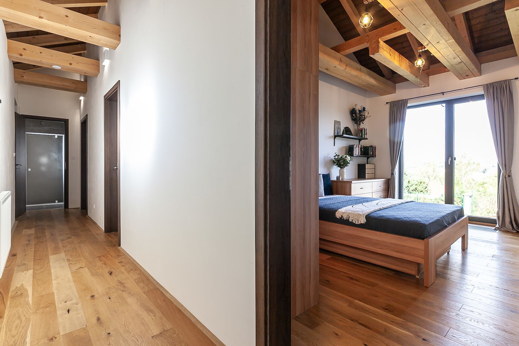 Spacious house built in 2021 with 7 rooms, 3 bathrooms, a wellness center in a rough construction state, and parking space for up to 5 cars, designed to serve as a home for a large family or for the needs of a small business, for accommodation, or as multi-generational housing. The house is shaped like an L, has two separate entrances, and can be divided into two independent parts. In addition to the above-standard area and number of rooms, the high ceilings with wooden beams give the rooms a sense of airiness even in height. The central part of the house features a huge living room with a kitchenette, a fireplace usable from both the inside and outside of the house, and a connection to an unfinished basement room intended as a wellness center.