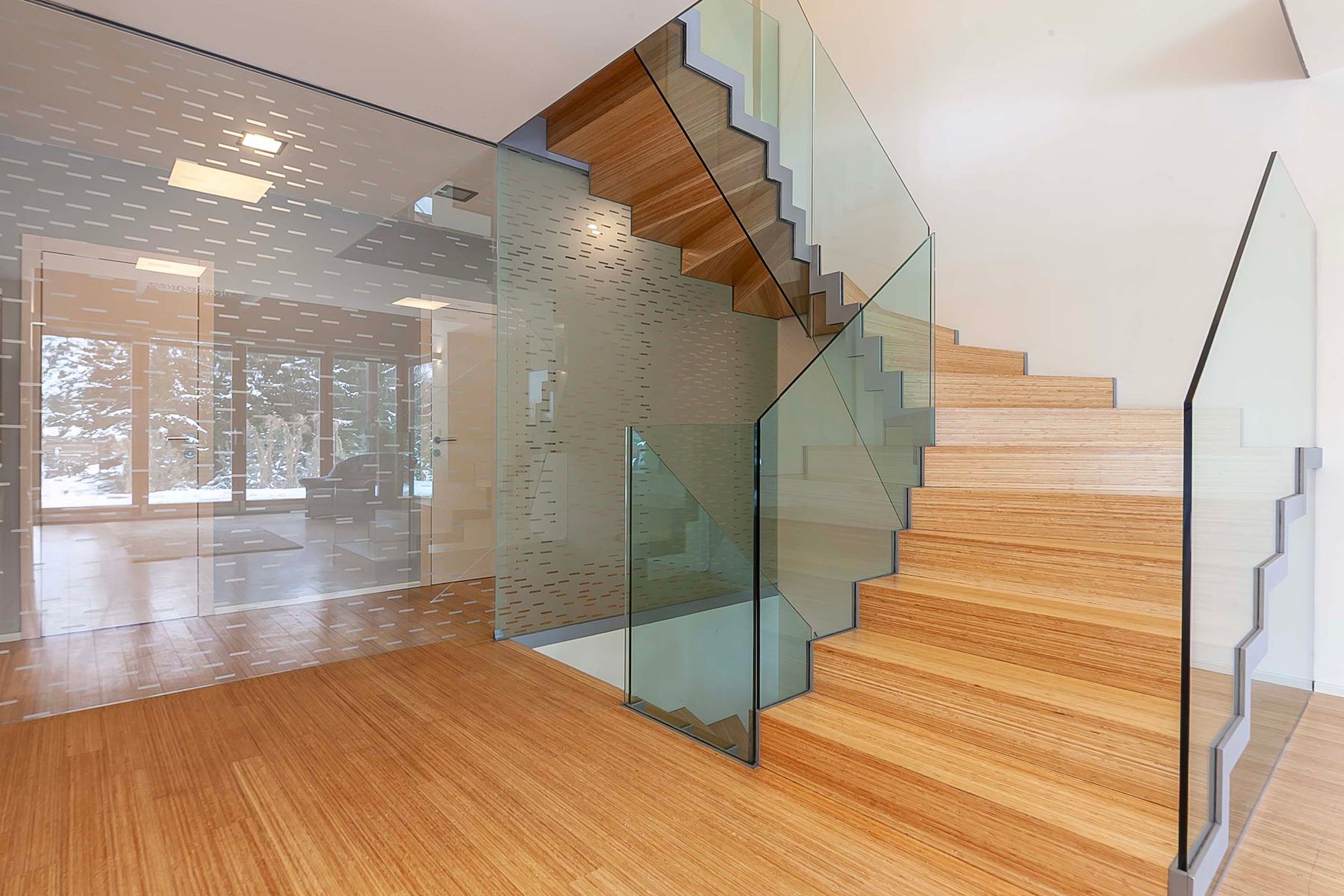 Dům o třech podlažích, dispozici 6+kk a celkové užitné ploše 310 m2 je zasazen do pozemku o rozloze 750 m2. Díky jižní orientaci je interiér po celý den zaplaven přirozeným světlem, které vyniká díky velkorysému prosklení a promyšlené práci se skleněnými zónami. Místnosti lze podle potřeby oddělovat, aniž by se vytratil pocit vzdušnosti a lehkosti.