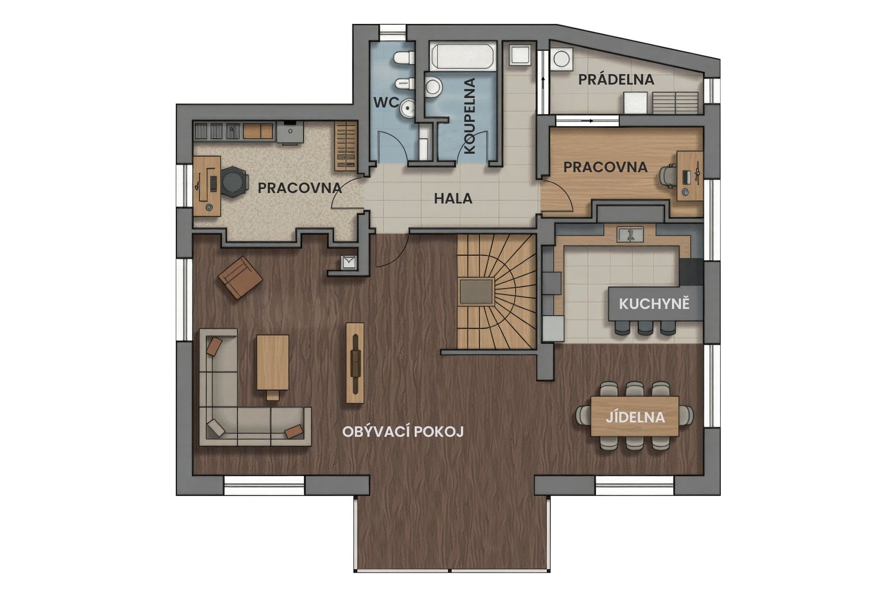 První nadzemní podlaží disponuje otevřeným prostorem obývacího pokoje propojeného s kuchyní vybavenou moderními spotřebiči, pracovnou, koupelnou, samostatnou toaletou a technickým zázemím. Zimní dny vám zpříjemní krbová kamna s vysokou výhřevností. V létě si budete užívat přímý vstup na slunnou terasu, ideální pro posezení během teplých dní.